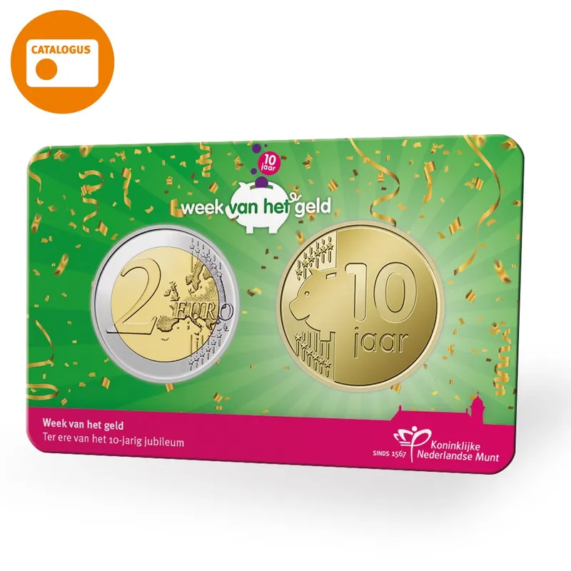 ‘Goed omgaan met geld is goud waard’ is het thema van het 10-jarig jubileum van de Week van het geld. De Week van het geld wordt georganiseerd door het platform Wijzer in geldzaken, onderdeel van het ministerie van Financiën, om aandacht te vragen voor financiële vaardigheden in het onderwijs. Door kinderen en jongeren financieel bewust te maken, wordt de basis gelegd voor financiële redzaamheid op volwassen leeftijd. Vanwege de coronacrisis is het 10-jarig jubileum van de Week van het geld, dat in 2020 zou plaatsvinden, verplaatst naar 22 t/m 26 maart 2021.Uitgifte met Nederlandse 2 euromunt 2021De Koninklijke Nederlandse Munt zet, als enige producent van Nederlandse euromunten, de Week van het geld in het zonnetje. Er is daarom niet alleen een speciale penning, maar ook een officiële 2 euromunt in de coincard geplaatst. Deze 2 euro uit 2021 zal niet in circulatie gaan en is, behalve in onze muntsets, niet los verkrijgbaar. Vanwege het uitstel van het Week van het geld-jubileum is dit bovendien de laatste coincard die wordt uitgegeven waarop het silhouet van het oude Muntgebouw te zien is.Op de voorzijde van de penning is het spaarvarken te zien uit het logo van de Week van het geld. Het opschrift op de voorzijde luidt ‘10 jaar’. Op de keerzijde staat het thema ‘Goed omgaan met geld is goud waard’. De voorzijde van de penning ziet u op speelse wijze terug op de keerzijde. De muntjes die verspreid staan op de keerzijde, zijn namelijk exacte kopieën van de voorzijde! Dit vormt een feestelijk geheel.Specificaties penningMetaalMessingGewicht8,40 gDiameter26,5 mmKwaliteitBrilliant UncirculatedRandGladOplageNader te bepalen in augustus 2021Specificaties 2 euromuntMetaalBi colourGewicht8,50 gDiameter25,75 mmKwaliteitBrilliant UncirculatedNominale waarde2 euroRandschrift* GOD * ZIJ * MET * ONS
