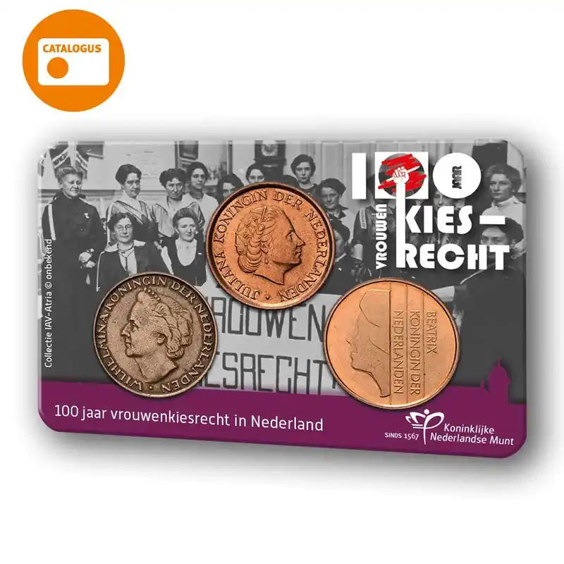 De zeer geliefde numismatische coincard die elk jaar wordt uitgegeven draagt dit jaar het thema ‘100 jaar vrouwenkiesrecht in Nederland’. Op de voor- en keerzijde van deze coincard worden meerdere vrouwen geëerd die streden voor het vrouwenkiesrecht, waaronder Aletta Jacobs.Tegenwoordig kan iedere Nederlander vanaf 18 jaar stemmen bij verkiezingen voor de Tweede Kamer, de Provinciale staten, de Gemeenteraad en het Europees Parlement. Echter werd pas in 1917 het ‘passief kiesrecht’ voor vrouwen in Nederland ingevoerd. Vrouwen konden vanaf dat moment worden gekozen voor politieke functies, maar mochten zelf niet stemmen. In 1919 kregen vrouwen het felbegeerde ‘actief kiesrecht’ waardoor ze zelf mochten stemmen. ©AtriaVoorzijdeOp de voorzijde van de munten prijken de drie vorstinnen Wilhelmina, Juliana en Beatrix op de historische stuivers.Op de voorzijde van de coincard is een zeer bekende afbeelding weergeven: de Sinterklaasbijeenkomst van 1915. Dit was één van de protestbijeenkomsten die werden georganiseerd door het Haagsche Propaganda Comité voor vrouwenkiesrecht.KeerzijdeDe keerzijde van de stuivers bevat de karakteristieke “5 CENT” met een oranjetak en in het geval van de stuiver met Beatrix een onderbroken rechthoek.Op de keerzijde van de coincard staat één van Nederlands bekendste feministen: Aletta Jacobs. Aletta Jacobs was de eerste vrouw in Nederland die universitair onderwijs volgde, de eerste vrouw die arts werd en de eerste vrouw die promoveerde. In 1882 wilde ze zich op de kieslijst van Amsterdam plaatsen, maar werd geweigerd. Zij sloot zich daarom aan bij de Vrije Vrouwen Vereeniging en werd later presidente van de Vereeniging voor Vrouwenkiesrecht in Nederland. ©Atria