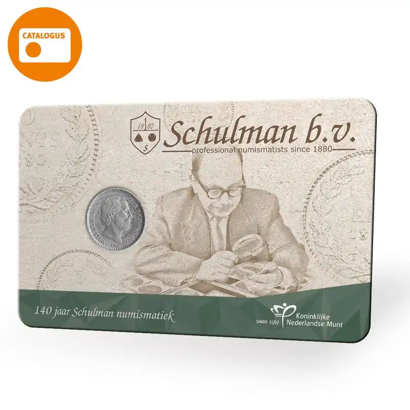 De Koninklijke Nederlandse Munt viert de 140e verjaardag van veilinghuis Schulman met een zeer streng gelimiteerde numismatische coincard. Bestel snel, want op is op!140 jaar SchulmanDe oudste muntenveilig van Nederland bestaat 140 jaar. De naam Schulman is uitgegroeid tot een begrip in de numismatische wereld in binnen- en buitenland. In 1880 verscheen de eerste numismatische publicatie van oprichter Jacob Schulman (1849 – 1936). Het familiebedrijf is vervolgens jarenlang overgegaan van vader op zoon. In 2006 werd Schulman overgenomen door Eddy Absil en John Saunders. Nog steeds wordt er maar liefst drie maal per jaar een veiling georganiseerd. De veilingen richten zich voornamelijk op Nederlandse munten (middeleeuws, lage landen, provinciaal, Koninkrijk, koloniaal en VOC), bankbiljetten, penningen en jetons.Zeer bijzondere uitgifteDe voorzijde van de bijzondere coincard in nostalgische stijl toont Jacques Schulman (kleinzoon van oprichter Jacob Schulman). Met een loep in zijn hand taxeert hij een collectie penningen. De coincard bevat een originele zilveren 5 guldencent uit de periode 1850-1887*, de beginperiode van het veilinghuis Schulman. De zeer bijzondere munt toont het portret van Koning Willem III, kijkend naar rechts. Willem III was van 1849 tot 1890 Koning der Nederlanden.*Het is niet mogelijk vooraf te bepalen welk jaartal u ontvangt vanwege het geringe aantal beschikbare stukken. Vanwege de hoge populariteit van de numismatische coincard is de uitgifte gelimiteerd tot 1 per persoon.
