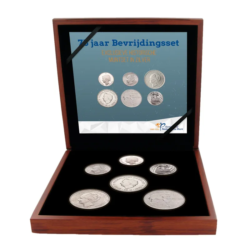 De 75 jaar Bevrijdingsset bevat een unieke Zilveren replica in de allerhoogste kwaliteit Proof en vijf originele historische Zilveren munten uit Nederland ten tijde van de Tweede Wereldoorlog of ter nagedachtenis daarvan. Bezetting en bevrijding worden samengebracht in deze bijzondere set. De set bevat historische munten evenals originele herdenkingsmunten uit zowel het gulden- als het eurotijdperk en toont bovendien de beeltenissen van vorstinnen Wilhelmina, Juliana en Beatrix. Dit maakt de set een zeer bijzonder numismatisch eerbetoon aan vrijheid door de jaren heen dat niet mag ontbreken in uw verzameling!Verzetsdaad in ZilverDe munt ‘Wilhelmina in Londen’ betreft een replica van een onofficiële guldenmunt die tijdens het verzet bewerkt werd: Wilhelmina kreeg een helm en het bestaande opschrift ‘WILHELMINA KONINGIN DER NEDERLANDEN’ werd weg gevijld en aangepast naar ‘WILHELMINA …………..IN …. ……………LONDEN’. Ter vergelijking bevat de set ook een originele 1 guldenmunt uit 1940.Specificaties:Replica 1 gulden 1940 ‘Wilhelmina in Londen’ Proof-kwaliteitMetaalZilver 925/1000Gewicht10 gDiameter28,1 mmRandGladJaartal1940VoorzijdeWilhelmina met een helm op haar hoofd. Tekst: Wilhelmina in LondenKeerzijdeGekroond landswapen, 1 G, tekst: MUNT VAN HET KONINGRIJK DER NEDERLANDEN, muntmeesterteken, munthuisteken, zilverkeur en R van replica.‘Wilhelmina Gulden’ – 1 gulden 1940MetaalZilver 720/1000Gewicht10 gDiameter28 mmRandschriftGOD * ZIJ * MET * ONS *Nom. Waarde1 guldenJaartal1940VoorzijdeWilhelmina portret met opgestoken haar naar links. Tekst: WILHELMINA KONINGIN DER NEDERLANDENKeerzijdeGekroond landswapen, 1 G, tekst: MUNT VAN HET KONINGRIJK DER NEDERLANDENMuntslag tijdens de Tweede WereldoorlogOmdat er tussen 1941 en 1944 alleen zinken oorlogsmunten werden geslagen in Nederland ging de productie van Zilveren betaalmunten tijdens de bezetting in beperkte mate door in Amerika. De originele rijksdaalder uit 1943 uit de set draagt daarom de letter ‘D’, de letter 'D' is het munthuis(teken) van het Amerikaanse munthuis te Denver in de staat Colorado, USA (U.S. Mint Denver). De letter D staat rechtsonder tussen het Wapen en de laatste letter N van NEDERLANDEN. Daarnaast is er op deze rijksdaalder ook een muntmeesterteken te vinden in de vorm van een palmboom. De letter is terug te vinden tussen het gekroonde Wapen van Nederland en de letter 'M' van 'MUNT' en behoort toe aan dr. J.W.A. van Hengel.Specificaties:‘Wilhelmina Rijksdaalder’ – 2 ½ gulden 1943DMetaalZilver 720/1000Gewicht25 gDiameter38 mmRandschriftGOD * ZIJ * MET * ONS *Nom. Waarde2 ½ guldenJaartal1943VoorzijdeWilhelmina portret met opgestoken haar naar links. Tekst: WILHELMINA KONINGIN DER NEDERLANDENKeerzijdeGekroond landswapen, 2 ½ G, tekst: MUNT VAN HET KONINGRIJK DER NEDERLANDEN. D van DenverZilveren gedenkmunten na de Tweede WereldoorlogDe set bevat daarnaast drie officiële historische herdenkingsmunten: ‘Nederland herrijst’ uit 1970 (de eerste herdenkingsmunt van dit land!), ‘Vijftig jaar bevrijding’ uit 1995 en het ‘Vredes Vijfje’ uit 2005.Specificaties:‘Nederland herrijst’ (allereerste Nederlandse herdenkingsmunt) – 10 gulden 1970MetaalZilver 720/1000Gewicht25 gDiameter38 mmRandschriftGOD * ZIJ * MET * ONS *Nom. Waarde10 guldenJaaral1970VoorzijdePortret Juliana naar rechts. Tekst: JULIANA KONING DER NEDERLANDENKeerzijdePortret Wilhelmina naar links. Tekst: NEDERLAND HERRIJST 1945 * 10 G * 1970‘Vijftig jaar bevrijding’ – 50 gulden 1995Metaal925/1000Gewicht25 gDiameter38 mmRandschriftGOD * ZIJ * MET * ONS *Nom. Waarde50 guldenJaartal1995VoorzijdePortret van Beatrix naar links. Tekst: BEATRIX KONINGIN DER NEDERLANDENKeerzijdeGrafische weergave van het getal 50 en 50 G. Tekst: VIJFTIG JAAR BEVRIJDING 1945 – 1995“Vredes Vijfje” – 5 euro 2005MetaalZilver 925/1000Gewicht11,9 gDiameter29 mmRandschriftGOD * ZIJ * MET * ONS *Nom. Waarde5 euroJaartal2005VoorzijdeBeatrix tot haar middel met gevouwen handen en hoed naar links, met op de achtergrond stippen, met euromuntteken ‘ster’. Tekst: BEATRIX KONINGIN DER NEDERLANDENKeerzijdeUit puntjes opgebouwde 5, waarde aanduiding, tekst: VREDE 60 JAAR 2005, met op de achtergrond stippen.De historische munten worden bewust zonder capsel in de set geplaatst zodat u de munten het best kunt bewonderen en voelen. Omdat de replica in de hoogste kwaliteit Proof geslagen is vindt u deze munt om de kwaliteit te waarborgen wél in capsel.
