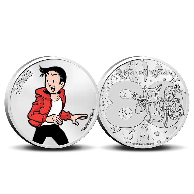 Eerdere helden vierden hun jubileum al met een kleurrijke penningen collectie. Nu Suske en Wiske hun 80ste vieren, geeft de Koninklijke Nederlandse Munt, in samenwerking met de Standaard Uitgeverij, de 80 jaar Suske en Wiske ‘Puike Penningen’ Collectie uit! Een collectie van twaalf geliefde personages uit de bekende, nog altijd actuele, stripreeks.SuskeTante SidoniaWiskeSus AntigoonProfessor BarabasJeromKrimsonDe zwarte madamArthurTheofiel BoemerangSchanullekeLambik(volgorde en visuals onder voorbehoud)OntwerpElke uitgifte is voorzien van een populair personage uit de iconische stripreeks in kleur op de voorzijde met in reliëf de naam. Op de keerzijde ziet u het 80 jaar Suske en Wiske-logo. De uitgiften worden geleverd in een beschermende capsule. Bij de derde levering ontvangt u een op een stripalbum gelijkend verzamelalbum met extra achtergrondinformatie. De penningen kunnen er veilig en overzichtelijk in geplaatst worden. Bestel snel en verzamel uw eigen Suske en Wiske jubileum album bij elkaar!LET OP: Alle collectie teksten zijn in het Nederlands.