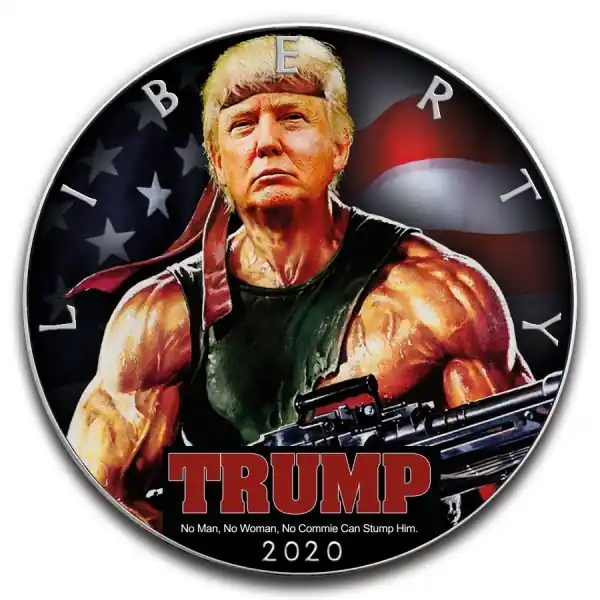 De presidentsverkiezingen staan voor de deur in de Verenigde Staten. Ter ere van de aankomende verkiezingen en de huidige zittende president Trump is deze zilveren American Eagle onder handen genomen. Op de voorzijde van de munt zien we het gezicht van president Trump met het lichaam van Rambo uit de klassieke film Rambo: First Blood. Deze typisch Amerikaanse munt wordt geleverd inclusief luxe geschenkdoos en een certificaat van echtheid. De munt weegt 31,1304 en bevat – net als de originele American Eagle – .999 puur zilver. Van deze bijzondere munt zijn er slechts 100 stuks wereldwijd gemaakt.