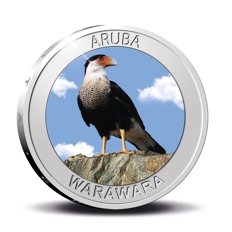 De Arubaanse herdenkingsmunt van 2022 staat in het teken van de Warawara, een roofvogel die veel voorkomt op Aruba. De Warawara is een grote, bruinzwarte vogel met lange poten. Vooral de snavel van de Warawara is bijzonder: deze is krom en heeft een spitse, haakvormig gebogen punt. De Warawara eet voornamelijk de kadavers van wilde geiten, maar hij voedt zich ook graag met muizen en hagedissen. Deze roofvogel voelt zich het meest thuis boven de heuvels, het laagland en boven de oceaan. Dreigt er gevaar? Dan verschuilt de Warawara zich onder de struiken of cactussen. Vooral in het Nationaal Park Arikok komt deze roofvogel steeds vaker voor. Dit Arubaanse dier is nu ook terug te vinden op een officiële herdenkingsmunt. Deze bijzondere gekleurde munt is een echte aanwinst voor uw verzameling!