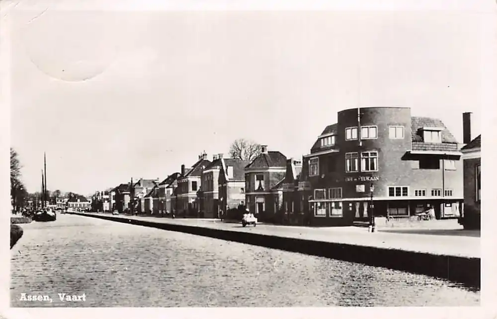 G.F. Hummelen’s Boekhandel, Assen. Gelopen ansichtkaart met postzegel en stempel 1948. Knikje bij hoekje postzegel.