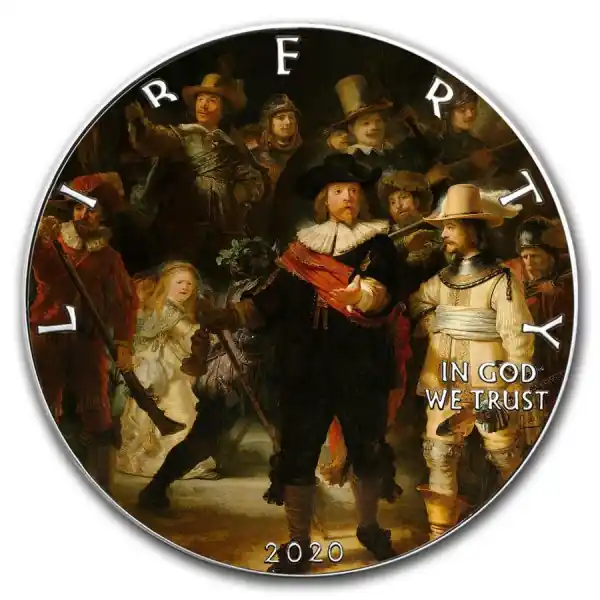 Deze American zilveren Eagle is een eerbetoon aan een van de beroemdste kunstwerken van Rembrandt: de Nachtwacht. Deze bijzondere munt wordt geleverd inclusief luxe geschenkdoos en een certificaat van echtheid. De munt weegt 31,1304 en bevat – net als de originele American Eagle – .999 puur zilver. Van deze bijzondere munt zijn er slechts 100 stuks wereldwijd gemaakt.