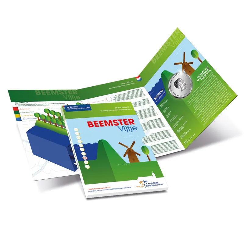 Aanleiding uitgifteSinds 2012 wordt er ieder jaar een bijzondereherdenkingsmunt uitgegeven in het teken van het Nederlands Werelderfgoed. Het Koninkrijk der Nederlanden heeft sinds 2014 tien door UNESCO erkende wereld­erfgoederen, waarvan de Koninklijke Nederlandse Munt inmiddels al zeven op een herdenkingsmunt heeft verzilverd. Nu is het dan tijd voor de achtste uitgifte: Het Beemster Vijfje!Het Beemster Vijfje vertelt het verhaal van de historische droogmakerij in de provincie Noord-Holland, waar de Nederlanders grote delen land drooglegden en omzetten in vruchtbare landbouwgrond. Dit jaar viert Droogmakerij de Beemster alweer het 20-jarig jubileum als UNESCO werelderfgoed!Staat u onder water?Op het ontwerp van de verpakking is een doorsnede van het landschap van De Beemster te zien; met water dat wordt tegengehouden door een dijk. Naast de dijk staat een molen, waarmee in de zeventiende eeuw De Beemster werd drooggelegd. De doorsnede benadrukt dat iedereen in De Beemster onder de zeespiegel leeft. Een unieke gewaarwording, welke symbool staat voor de drooglegging van het Beemstermeer en het belang van onze Nederlandse dijken. Wanneer de dijken doorbreken is er zomaar een kans dat ook uw woonplaats onder water komt te liggen. Bij iedere bestelling van één van de herdenkingsmunten van De Beemster, krijgt u een gratis NAP kaart, waarop u kunt zien of uw woonplaats onder de zeespiegel ligt.Let op: zolang de voorraad strekt!Ontworpen door Katrin KorfmannDe in Amsterdam wonende Duitse kunstenares Katrin Korfmann is de ontwerpster van het Beemster Vijfje. Zij tekende ook voor het in 2018 verschenen Schokland Vijfje. In de ontwerpen van beide munten benadrukt ze het contrast­ tussen de vrije, organische vorm van het natuurlijke landschap en het strakke, geconstrueerde raster van het polderlandschap. De voorzijde van de munt toont het en profil portret van de Koning, kijkend naar rechts: abstract maar herkenbaar. Portret, landschap, iconen en letters liggen dieper ten opzichte van het landschap, net zoals het voormalige Beemstermeer ten opzichte van het omringende oude land. Bij het Schokland Vijfje was dit precies andersom als verwijzing naar het voormalige eiland, dat boven de Zuiderzee uitstak. Voor de typografie werkte Korfmann samen met Céline Hurka.