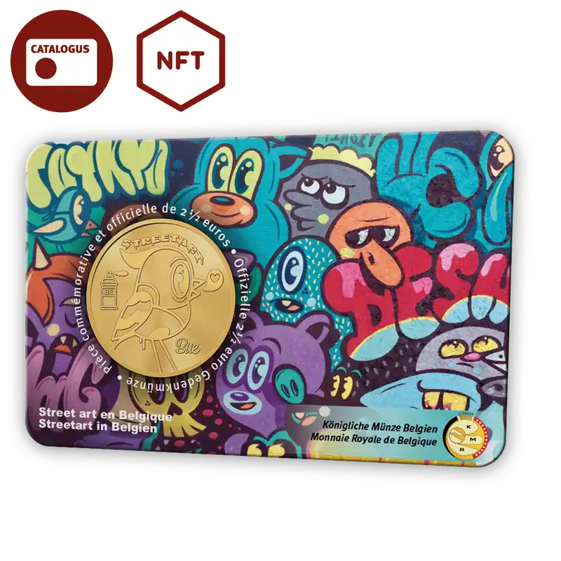 Hoewel de talloze artiesten zelf zelden bekend zijn, komen we in België quasi dagelijks in contact met hun creatieve uitingen die het straatbeeld opfleuren. Anders dan graffiti heeft streetart vaak een duidelijkere boodschap en een muurvullend beeld, regelmatig ook in opdracht geplaatst. De kwaliteit is hoog en de kunstenaar wil met het werk in de openbare ruimte de aandacht trekken en iets teweegbrengen.Veel Belgische steden zetten de streetart tegenwoordig letterlijk op de kaart en er worden steeds meer tours, festivals en apps bedacht om inwoners en toeristen langs alle kunst in de openbare ruimte te leiden. Nu is er in samenwerking met vijf gerenommeerde Belgische straatartiesten een NFT* collectie gecreëerd en aan de muntuitgifte in coincard toegevoegd. De collectie bestaat uit 2 x 5.000 speciale 2 ½ euromunten België in coincard. De vijf straatartiesten geven een aardig beeld van de diverse kunststijlen die de muren van de Belgische steden sieren. Normaal muurgroot, nu op thuisformaat en in beweging!Een bijzondere kunstvorm verdient een bijzonder extra!Het fenomeen Streetart in België was voor de Koninklijke Munt van België aanleiding om een 2½ euromunt uit te geven in samenwerking met een van de bekendste straatartiesten van België: Bue the Warrior. Zowel het muntontwerp als de verpakking en de bijbehorende NFT is van zijn hand! De 2½ euro wordt geslagen in BU-kwaliteit en verschijnt in een coincard met twee taalversies. Omdat streetart in België zeer diverse verschijningsvormen heeft, zijn er nog meer werken van gerenommeerde Belgische straatartiesten als een gratis NFT* aan de coincard toegevoegd! Kijk snel welk speciaal voor de munt gemaakt werk van een van de vijf Belgische straatartiesten bij uw munt hoort als exclusief digitaal extraatje!De voorzijde van de munt toont een vrolijk vogeltje dat net als de tekst ‘Streetart’ net is gecreëerd met de spuitbus BE links. Het vogeltje komt vaker terug in het werkt van Bue the Warrior en is zodoende het signatuur van Bue, rechts onderin nog extra zijn naam.Het extraatje, de NFT*, is bij deze munt toegevoegd aan de coincard. Bekijk het stappenplan in de speciale folder of online en claim uw NFT. Er zijn vijf verschillende NFT’s in evenzoveel gradaties van zeldzaamheid. Het betreft exclusieve, nog niet eerder vertoonde, werken van: Bue the Warrior, LS, LobsterRobin, Resto en Toys.* NFT: staat voor Non-Fungible Token. Een NFT is een digitaal eigendomscertificaat, opgeslagen op een blockchain, wat verwijst naar een digitaal media-object. Aan 2 x 5.000 coincards 2 ½ euro Streetart in België 2025 zijn QR codes toegevoegd waarmee een NFT kan worden geclaimd. Er zit zodoende een exclusief extraatje bij de munten!U ontvangt de coincard in een speciale folder met stap voor stap uitleg. Ook kunt u meer informatie en uitleg vinden op www.herdenkingsmunten.be/nft