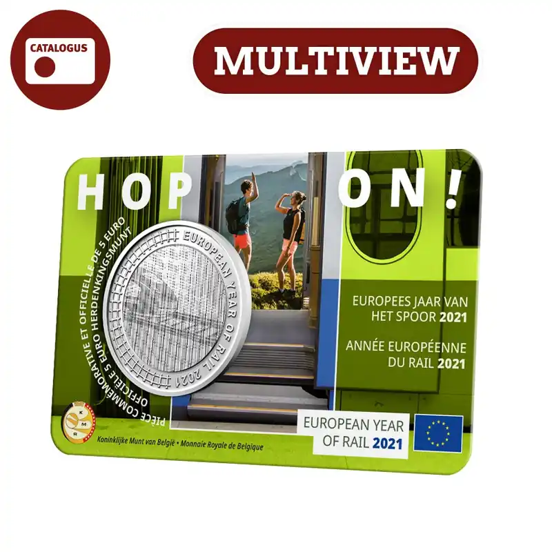 Het jaar 2021 is door de Europese Unie uitgeroepen tot Jaar van het Spoor. Het hele jaar door zullen er in Europa (online) evenementen en initiatieven plaatsvinden om het aandeel mensen en goederen dat zich per spoor verplaatst te vergroten. Dit is één van de doelstellingen van de Europese Green Deal. Vervoer per trein is namelijk milieuvriendelijk, comfortabel en veilig. Het Europees Jaar van het Spoor is bedoeld om de trein te promoten als een duurzaam vervoersmiddel.Vorig jaar stond de Koninklijke Munt van België stil bij de allereerste trein die in 1835 op het Europese vasteland reed. Deze bijzondere zilveren munt krijgt nu een numismatisch vervolg! Het Europees Jaar van het Spoor wordt gevierd met een officiële 5 euromunt in genummerde coincard. Het muntontwerp is van de hand van Iris Bruijns en lijkt echt te bewegen dankzij de multiview techniek. De trein rijdt een stukje vooruit wanneer de munt wordt bewogen van links naar rechts.De genummerde verpakking sluit helemaal aan bij de campagne Hop On: #EUYearofRail! Dus waar wacht u nog op? Spring aan boord en stel één van de slechts 12.500 bijzondere 5 euromunten zeker.