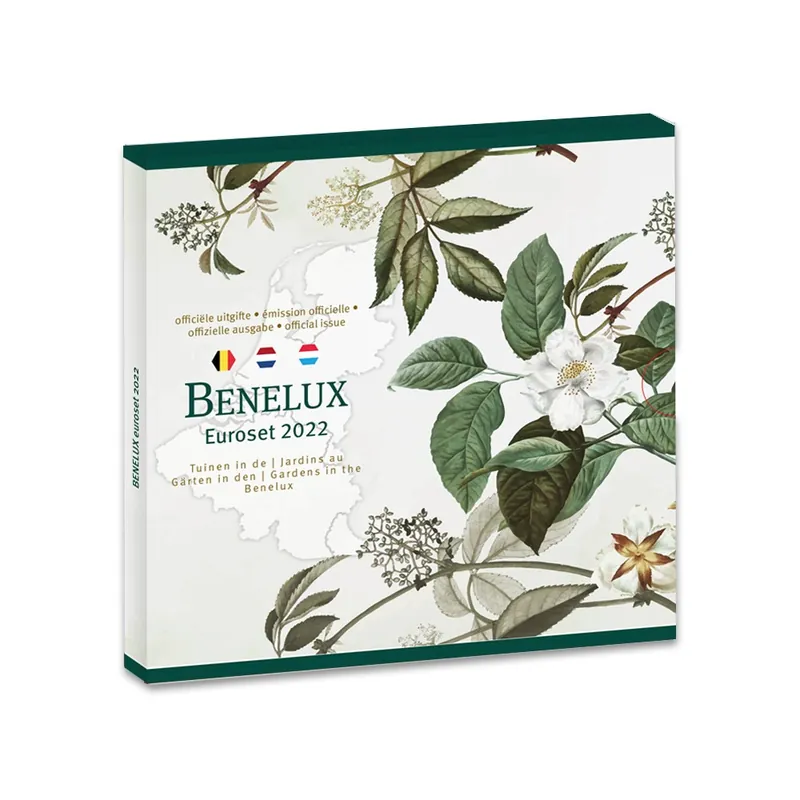 Botanische tuinen in de BeneluxDat een groene leefomgeving goed is voor mens en milieu, kan niet vaak genoeg aangegeven worden. Meer groen heeft een positief effect op de gezondheid van mensen, maar ook op wonen en werken. Recreëren in een groene omgeving zorgt voor sociale verbindingen. Groen in de stad is ook goed voor het milieu: het levert een rijke biodiversiteit, vermindert luchtvervuiling, zorgt voor waterhuishouding, kan bij geluidshinder dempend werken en verkoelt in warme tijden.Een Hortus Botanicus noemen we tegenwoordig gewoon botanische tuin en in Vlaanderen plantentuin. Een dergelijke tuin heeft een wetenschappelijke plantencollectie, vaak aangevuld met bloemplanten en bomen. Een botanische tuin is meestal verbonden aan een universiteit. Naast wetenschappelijk onderzoek, hebben dergelijke plantentuinen ook een beheerfunctie (planten voor uitsterven behouden) en voeren ze educatieve taken uit door de planten te tonen en kennis te delen. De botanische tuinen in de Benelux verfraaien en vergroenen, zonder uitzondering, de stedelijke gebieden van de Benelux.Alle Benelux euromunten 2022 op een rijDeze fraaie muntenset groepeert alle 24 euro’s van 2022 uit België, Nederland en Luxemburg in een onberispelijke BU-kwaliteit. De luxe vierluik kaartverpakking met genummerde sleeve staat dit jaar geheel in het teken van drie van de allermooiste botanische siertuinen van de Benelux: de Nationale Plantentuin te Meise, de Hortus Botanicus van Utrecht en het Luxemburgse Arboretum du Kirchberg dat in drie prachtige parken is opgedeeld. Deze drie groene landschapsparels behoren zonder meer tot de absolute wereldtop en moet u zeker eens gezien hebben!De set bevat daarnaast een exclusieve penning met een diameter van 30 mm. Op de voorzijde een zeer fraai gevormde rozenboog. Deze geeft een doorkijkje naar een fontein waar insecten en vogels zich tegoed doen aan een weelde van bloemen en planten. Tekst op de penning: Tuinen in de ǀ Jardines au ǀ Gärten in den ǀ Gardens in the Benelux. De keerzijde toont de plattegrond van de Benelux. Een tulp bij Nederland, grote klaprozen bij België en de nationale roos bij Luxemburg. Een zwaluw, bij en vlinder maken samen met het jaartal 2022 en het munthuis- en muntmeesterteken het plaatje compleet.Specificaties penning:Metaal:Cu/NiKwaliteit:Brilliant UncirculatedGewicht:9,5 gDiameter:30 mmRand:GladOntwerpGina BijlardOplage:Max. 5.000 (alleen als onderdeel van set)