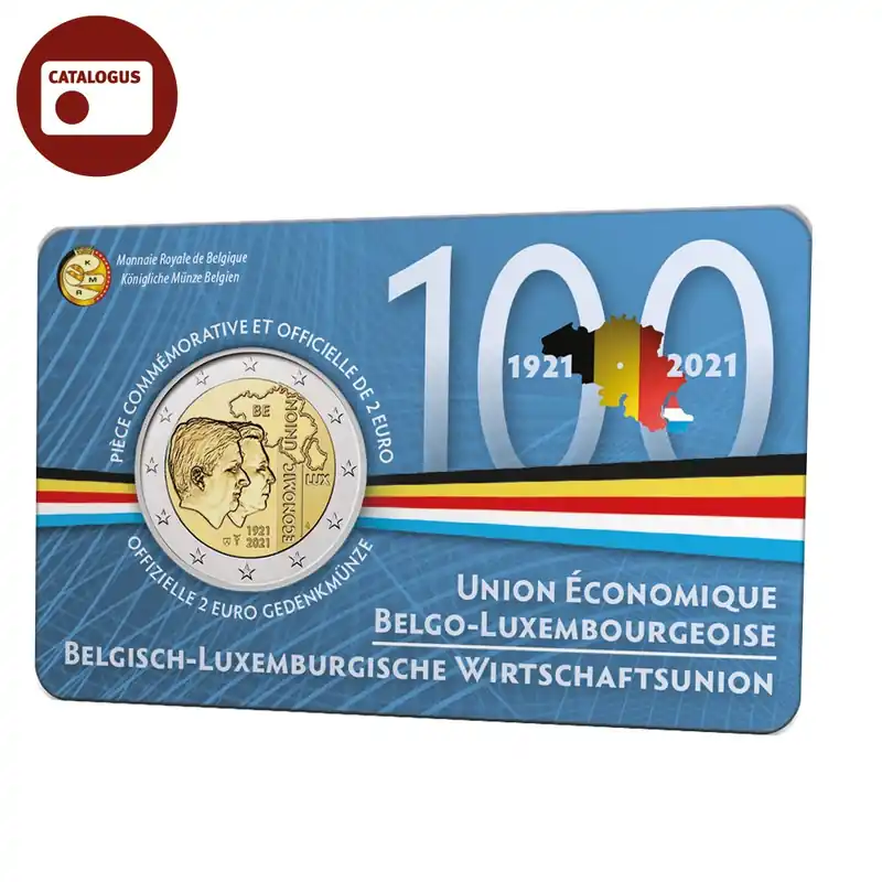 100 jaar geleden werd op 25 juli (1921) de Belgisch-Luxemburgse Economische Unie, afgekort BLEU, gesloten tussen België en Luxemburg. In eerste instantie zou de BLEU bestaan voor een periode van vijftig jaar. Het bondgenootschap was zowel een douane-unie als een muntunie. Dit hield in dat de Belgische frank en de Luxemburgse frank aan elkaar waren gekoppeld. De wisselkoersen van de twee munten waren gelijk aan elkaar tot de vervanging door de euro in 2002.Ter ere van dit langlopende en vreedzame verbond heeft de Koninklijke Munt van België een nieuw 2 eurostuk uitgebracht. De 2 euromunt toont een dubbelportret van Koning Filip I van België en Groothertog Henri van Luxemburg naar rechts. Zij kijken naar de contourweergave van België en Luxemburg, de bondgenoten in de Belgisch-Luxemburgse Economische Unie. De munt is verpakt in een internationale coincard waarop de verbinding van beide landen door het 100-jarige bondgenootschap wordt benadrukt.