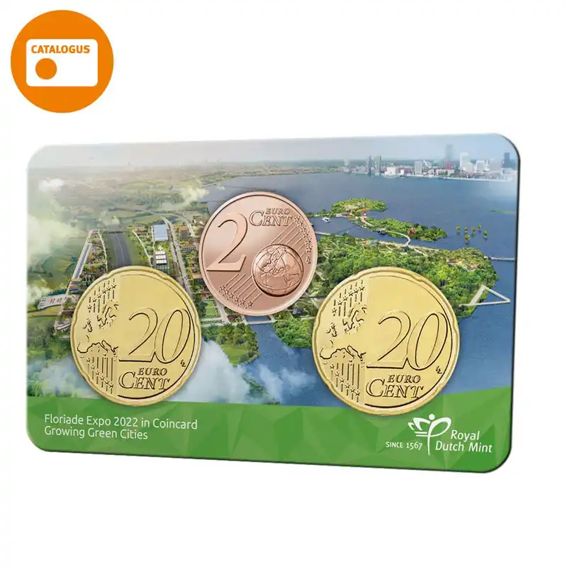 Ter herinnering aan Floriade Expo 2022 brengt de Koninklijke Nederlandse Munt een speciale coincard uit met twee Nederlandse 20 eurocenten en een 2 eurocent uit 2022. De groene coincard is niet alleen groen qua kleur, maar draagt ook bij aan een groenere wereld. Een gedeelte van de opbrengst van deze coincard gaat namelijk naar het planten van een bos.Floriade Expo 2022Floriade Expo is een wereldtuinbouwtentoonstelling die maar eens de tien jaar georganiseerd wordt. Vanaf 14 april tot en met 9 oktober 2022 zal een deel van Almere omgetoverd worden tot één grote bloeiende tuin. Binnen het thema ‘Growing Green Cities’, dat aandacht vraagt voor het vergroenen van steden, presenteren meer dan 400 (inter)nationale deelnemers hun nieuwste groene uitvindingen. U kunt wandelen door de tuinen en het arboretum, culinair verrast worden door groene gerechten of meegenieten van het culturele programma: een bezoekje aan Floriade is zeker de moeite waard.Growing Green CitiesHet zal u niet verbazen dat groen dé kleur is van Floriade en deze kleur komt dan uiteraard ook terug op de coincard. Op de voorkant ziet u de plattegrond van Floriade, met vele tuinen en zelfs een stukje bos in de vorm van een arboretum! Op de keerzijde het logo van Floriade en de icoontjes die uitbeelden wat er op Floriade allemaal te beleven valt. Zo ziet u een kas als symbool voor de groene pracht en praal die u kunt zien, muzieknoten voor het culturele programma en nog veel meer. In de coincard zitten drie Nederlandse euromuntjes uit 2022 in BU-kwaliteit: twee 20 centmuntjes en een 2 centmunt. Samen symboliseren deze het jaar 2022. Met een gedeelte van de opbrengst van de coincards wordt er een bos geplant, waardoor u zo ook nog eens bijdraagt aan Growing Green Cities!*Bij aankoop van de Floriade Expo 2022 coincard ontvangt u gratis de Coincard Catalogus 2022. Deze hoeft u niet los te bestellen, de Coincard Catalogus wordt automatisch aan uw winkelmandje toegevoegd, zolang de voorraad strekt (één catalogus per order).