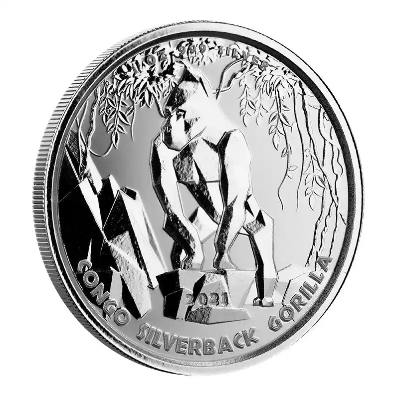 Deze 1 troy ounce Congo Gorilla 2021 zilveren munt is de nieuwste editie munt uit de Congo Gorilla serie, die jaarlijks wordt geproduceerd door de Amerikaanse fabrikant Scottsdale Mint. Het ontwerp van de munt is geïnspireerd op de Congolese zilverruggorilla en is geslagen in precies 1 troy ounce (31,1034 gram) zilver met een zuiverheid van .999.