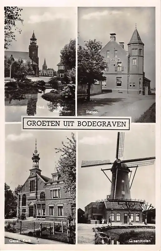 Uitg. Domburg’s Boekhandel, Bodegraven. Gelopen ansichtkaart met postzegel en stempel 1952.