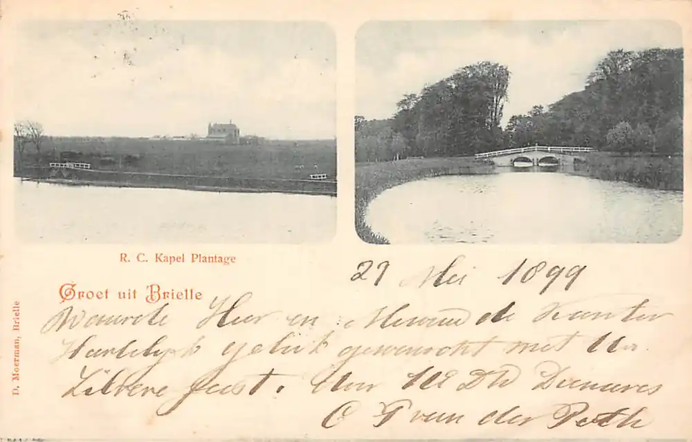D. Moerman, Brielle, Mooie gelopen ansichtkaart Met postzegel en stempel en twee kleinrondstempels Brielle 1899.