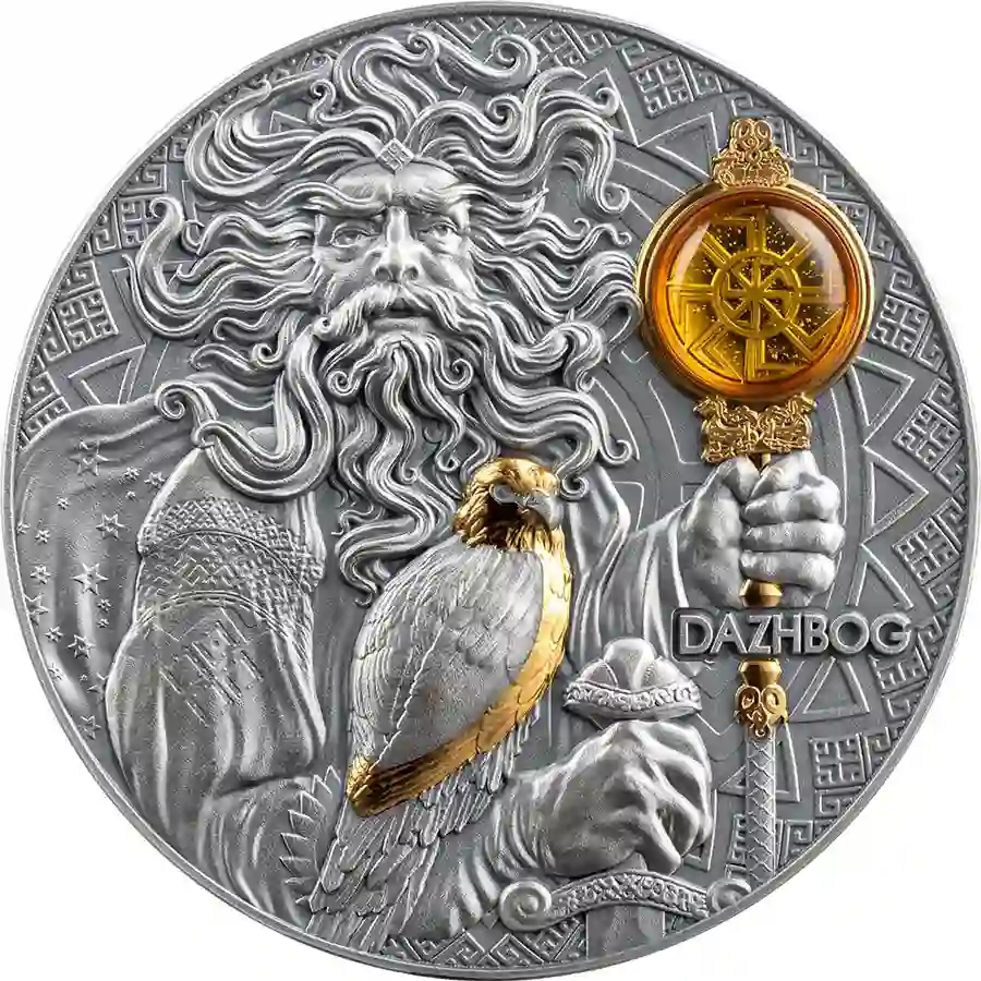 De “Divine Faces of the Sun” serie gaat verder met Dahzbog. De munt weegt 3 troy ounce (93,3102 gram) en bevat .999 puur zilver. In de Slavische mythologie belichaamt Dazhbog de levengevende essentie van de zon en koestert hij de aarde met warmte en licht. Een valk, de manifestatie van zo’n kracht, zit op Dahzbog’s onderarm – net als zonne-energie zweeft hij majestueus boven de grond. De ‘Sun-father’ beheerst ondertussen, in een traditioneel geborduurd shirt met een weelderige staf in de hand, de cyclus van de steeds draaiende natuur. De Dazhbog-munt glinstert met een amberkleurige inzet en vergulde accenten om het eeuwige licht van de Dahzbog te weerspiegelen. Deze bijzondere munt is uitgebracht in een uiterst beperkte oplage van 500 stuks wereldwijd en wordt geleverd in een luxe doos met certificaat van echtheid.