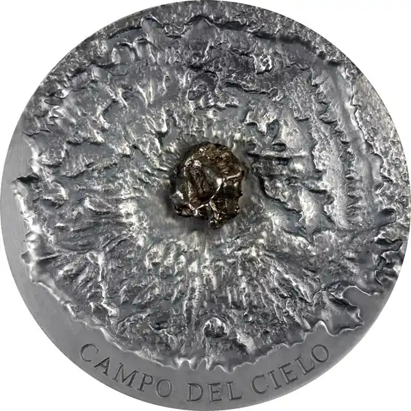 Deze bijzondere munt is afkomstig van de Meteorite Art-sries en is gewijd aan een van de grootste meteorieten die ooit op Aarde is neergevallen. Deze indrukwekkende munt is voorzien van een echt stukje Campo del Cielo-meteoriet, ingebed in een gedetailleerd beeld van een krater voorzien van een hoog reliëf. De munt is uitgebracht in een gelimiteerde oplagen van 500 stuks en wordt geleverd inclusief luxe doos.