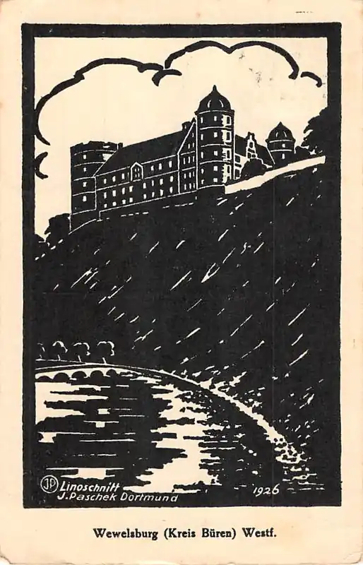 Linoschnitt J. Paschek, Dortmund. 1926. Gelopen ansichtkaart met postzegel en stempel 1927.
