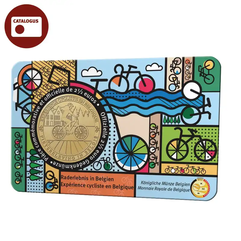De Belgische Fietstevredenheid stijgt jaarlijks! Ondervraagden in het FietsDNA onderzoek 2022 geven aan de fiets financieel aantrekkelijk, flexibel en snel te vinden. Verbeteringen in de (lokale) fietsinfrastructuur dragen ook bij aan de klimaatdoelstellingen van diverse gemeenten. Maar de fiets is al lang niet meer alleen een milieuvriendelijk en sportief vervoersmiddel. Het verschil tussen functioneel en recreatief fietsen verdwijnt snel. En dat is logisch in zo’n prachtig fietsland als België.Wist u dat?De fiets al meer dan 200 jaar bestaat?De fiets veel betekend heeft voor de emancipatie van vrouwen?Diverse Belgische steden fietsscholen en/of fietslessen voor volwassenen hebben? Omdat fietsen een emanciperende, versterkende en integrerende kracht heeft. Fietsen verandert levens en voorkomt vervoersarmoede.Fietsen je scherper en helderder maakt en zorgt voor een beter geheugen?Er ook fietsambassadeurs bestaan?Er ook fietstaxi’s zijn?Er een fietsroute is vernoemd naar Eddy Merckx?Deelfietsen in België heel populair zijn?Er in Belgisch Limburg diverse ‘fietslandmarks’ zijn zoals: Fietsen door het Water, Fietsen door de Boomtoppen en Fietsen door de Heide over een monumentale fietsbrug.Men over een oude spoorlijn kan fietsen? De Vennbahn is een fietsbeleving die door drie landen voert, 125 km lang over en langs een spoorlijn waarover meer dan een eeuw lang vooral kolen en ijzererts werd vervoerd.Dat België wel heel dol is op wielrennen? Tussen januari en oktober 2023 worden er meer dan 300 koersen georganiseerd!De mountainbikers ook zeer goed wegkomen in België met meer dan honderd vaste mountainbike routes?Men in België elk derde weekend van oktober de Dag van de Trage Weg viert? Speciaal voor wandelaars, fietsers en ruiters zijn er dat weekend bekende en onbekende trajecten en activiteiten in de natuur en door de stad.Een klinkende munt van 2½ euroals stimulatie om een blokje om te fietsenOp de beeldzijde prijkt een sportieve fietser die over een door spaken gevormd pad door het Belgische landschap zoeft. Het geheel is omringt door de tekst: EXPÉRIENCE CYCLISTE EN BELGIQUE en FIETSBELEVING IN BELGIE en twee miniatuur fietsen. Op de muntzijde staan de gebruikelijke grafische elementen zoals de waarde, het jaartal en de Europese landkaart afgebeeld. Een kleurrijke en vrolijke fiets-geïnspireerde coincard-verpakking zorgt voor de finishing touch.De coincard waarin de munt is gevat toont op grafische en kleurrijke wijze elementen van de fiets en fietsjes in diverse omgevingen.
