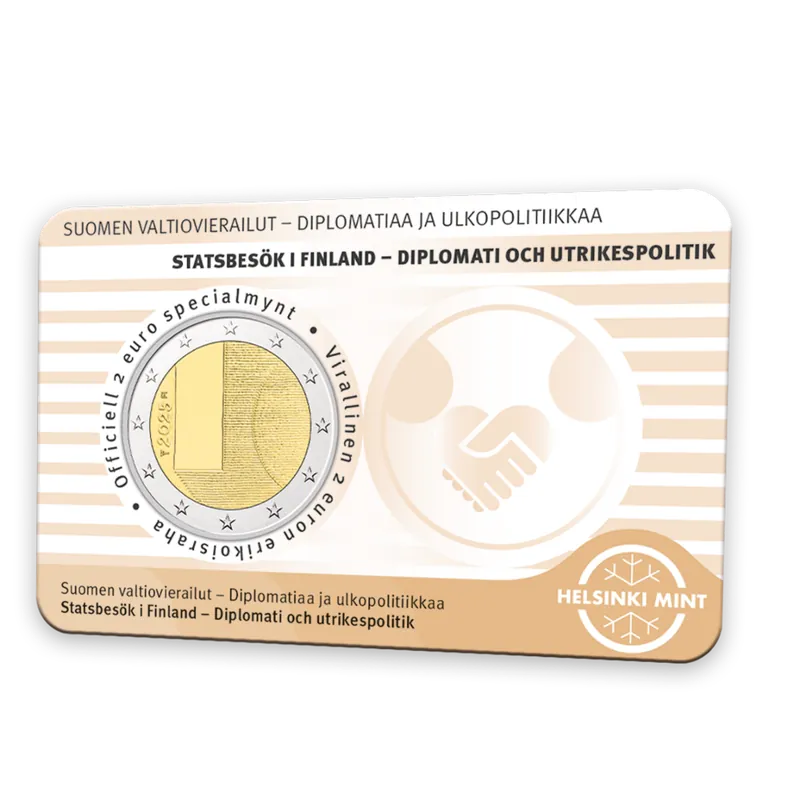 Elk jaar lanceert Helsinki Mint de 2 euro herdenkingsmunten voor Finland, in opdracht van het Ministerie van Financiën in Finland. In 2025 lanceert Helsinki Mint een 2 euro herdenkingsmunt voor de staatsbezoeken in Finland: de State Visits of Finland – Diplomacy and Foreign Policy BU-kwaliteit in coincard met Fins-/Zweedstalige voorzijde en Engelse keerzijde.Staatsbezoeken zijn altijd al belangrijk geweest voor Finland als het gaat om diplomatieke betrekkingen tussen staten en het uitvoeren van buitenlands beleid. Door de jaren heen zijn er verschillende tradities ontstaan waarvan sommigen vandaag de dag nog steeds worden toegepast. De presidenten van Finland vertegenwoordigen, ieder op hun eigen manier, de waarden, principes en doelen van Finland en haar cultuur.DesignDe 2 Euro State Visits of Finland – Diplomacy and Foreign Policy BU-kwaliteit komt in een goudgekleurde coincard, welke is ontworpen door Helsinki Mint. Het design van de coincard representeert de verbinding tussen Finland en de rest van de wereld. De tekst op de voorzijde is in het Fins en Zweeds en de tekst op de keerzijde is in het Engels.De 2 euromunt is ontworpen door Sinikka Inkeroinen-Huhta en Ilkka Huhta. Zij hebben gebruik gemaakt van het design van een deur, om de staatsbezoeken te symboliseren. Achter de deur vinden onderhandelingen plaats, worden relaties gevormd en wordt de toekomst gebouwd. De voorzijde laat een gladde deur zien met de rest van het design in een ruwer design. Op de keerzijde staat de nationale zijde van een 2 euromunt.