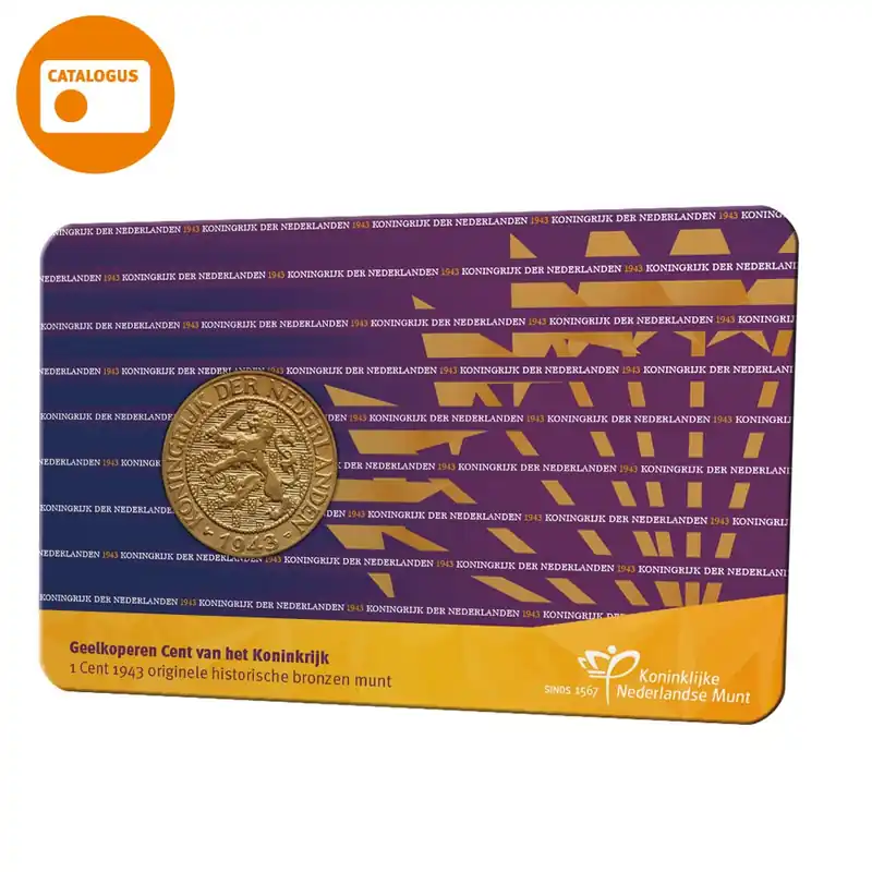 Ruim 80 jaar geleden verliet de laatste reguliere bronzen 1 guldencent de Rijksmunt. Als eerbetoon aan deze speciale uitvoering verschijnt er daarom een originele bronzen geelkoperen 1 centmunt 1943 in coincard.Een ongewone kleurDe eerste 1 centmunt van Nederland werd in 1817 onder Koning Willem I geslagen. De laatste bronzen 1 centmunt zonder portret verliet ’s Rijksmunt in 1941, nu alweer ruim 80 jaar geleden. Daarna werd de muntdenominatie nog in 1942 en 1943 in Amerika geslagen, met Suriname en Curaçao als bestemming.Onbewust is de munt uit 1943 de laatste reguliere uitgifte zonder portret gebleven. Ten tijde van WOII werd de 1 centmunt wel in een zinken variant geslagen. De helder gele kleur is het meest opvallende verschil, door de oorlogsomstandigheden bevat de brons legering naar verhouding meer tin waardoor de kleur geel in plaats van roodachtig is. De munt heeft als munthuisteken de P van Philadelphia en als muntmeesterteken een palmboom.