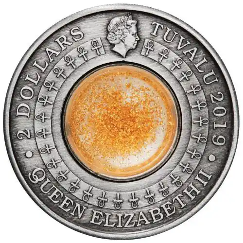 Deze bijzondere zilveren munt van de Australische Perth Mint is een ode aan de oude Egyptische cultuur en geschiedenis. De Golden Treasures of Ancient Egypt 2 troy ounce zilveren munt 2019 munt bevat 24-karaats gouddeeltjes die zijn ingekapseld in perspex. De gouden deeltjes zijn omringd door Egyptische hiërogliefen en symbolen. De symbolen omvatten heilige afbeeldingen die bescherming, en eeuwig leven symboliseren. De munt is uitgebracht in een gelimiteerde oplage van 2500 stuks en wordt geleverd inclusief bijzondere doos en certificaat van echtheid.