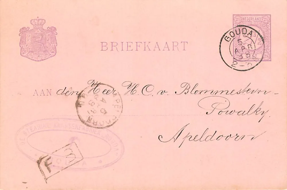 Mooie gelopen briefkaart met kleinrondstempels 1888 en stempel kaarsenfabriek Gouda. Filatelie.