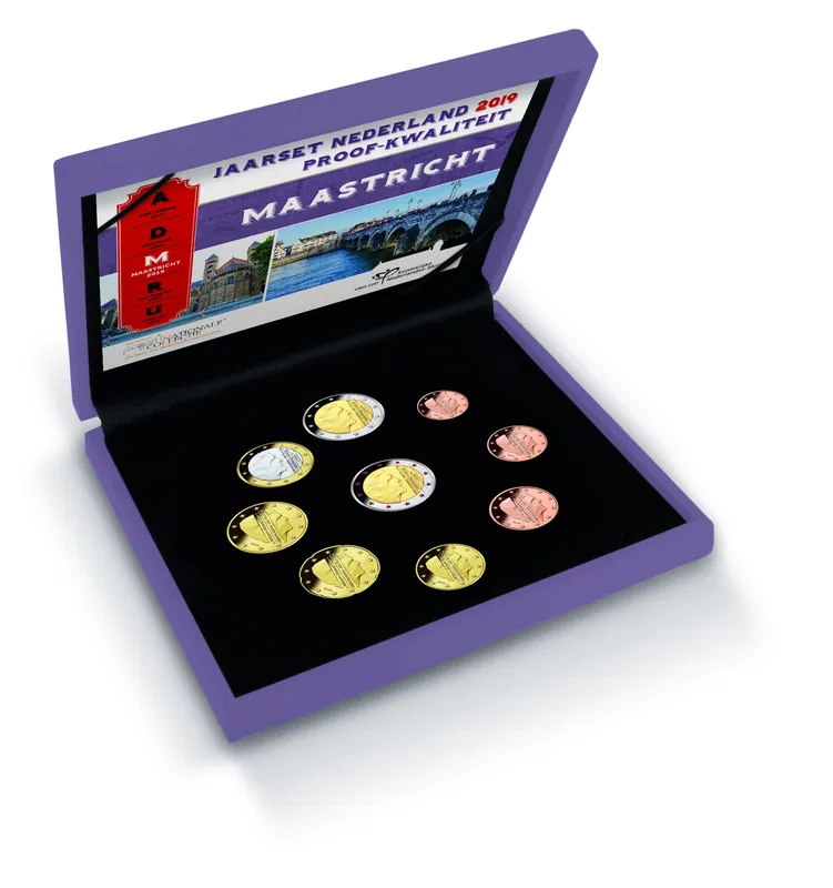 De Jaarset Nederland 2019 in Proof-kwaliteit is de officiële muntset van Nederland en bevat alle 8 nieuweeuromunten! Deze set is het derde deel uit de serie met het thema ‘Nederlandse Steden’ met dit jaar als stad: Maastricht. Dit is niet alleen de geboortestad van onze Muntmeester Stephan Satijn, maar ook de thuisstad van het bourgondische leven. Bovendien is Maastricht de geboortestad van de euro!Op vrijdag 7 februari 1992 tekenden de twaalf lidstaten van de Europese Gemeenschap het wereldberoemde Verdrag van Maastricht. Deze ceremoniële gebeurtenis was het startsein voor de vorming van de Europese Unie en de invoering van de nieuwe munteenheid. Op 1 januari 2002 rolde het eerste Eurobiljet uit de geldautomaat. Ook dat historisch moment vond plaats in de Limburgse hoofdstad.Leuk weetje: Het Muntmeesterteken is de Maastrichtse Sint Servaasbrug, deze staat op alle Nederlandse euromunten sinds eind 2017!Ieder jaar verzekerd van de Jaarset Nederland Proof-kwaliteit? Sluit eenabonnementaf!Voorheen: Proofset Nederland.Alle uitgiften maken onderdeel uit van het onder verantwoordelijkheid van de Koninklijke Nederlandse Munt samengestelde assortiment; kleuraccenten zijn niet in opdracht van de Staat aangebracht.