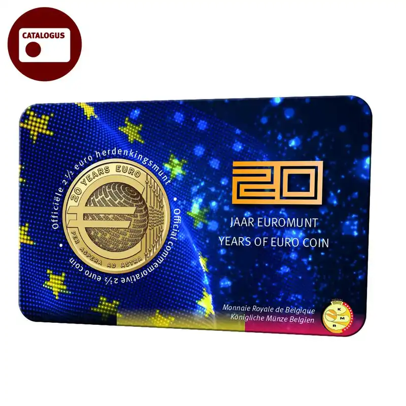 Sinds 2002 is de euro de munteenheid van 19 EU-landen met meer dan 340 miljoen inwoners en de op één na belangrijkste valuta ter wereld. Euromunten en eurobiljetten vormen een tastbare, dagelijkse herinnering aan de vrijheid, het betaalcomfort en de vele mogelijkheden die de Europese Unie ons te bieden heeft.Zo maakt de euro het ons makkelijk om met vertrouwen te sparen en te beleggen, om prijzen te vergelijken en zaken te doen alsook om makkelijker te werken, te studeren of zelfs met pensioen te gaan in het buitenland. Na 20 jaar zijn we nagenoeg vergeten dat we ooit in Belgische frank betaalden en dat we voor onze vakantie telkens naar de bank moesten hollen om een voorraad lires, peseta's of drachmes in te slaan.Een klinkende munt van 2½ euroals kers op de verjaardagstaartOp de beeldzijde prijkt het euroteken, op een globe achtige achtergrond van binaire getallen, eromheen quotes en 20 YEARS EURO. De getallenreeks: 11100010 10000010 10101100 staat voor het ‘€’. Het citaat onderaan “PER ASPERA AD ASTRA” is van ere-gouverneur Jan Smets, destijds de eurocommissaris, verantwoordelijk voor de invoering van de euro in België. “Via moeilijkheden naar de sterren”, is nog altijd actueel en treffend voor de invoering en het gebruik van de op één na grootste munteenheid ter wereld. Rechts in het ontwerp zijn sterren en strepen weergegeven, geïnspireerd op de waarde zijde van euro circulatie munten. In het pad van de sterren zijn de alledaagse voordelen van het gebruik van de euromunt benoemd: work, study, retire, travel, shopping, business (werk, studie, pensioen, reizen, winkelen, handel). Links onder de sterren staat de letter P, initiaal van graveur/modelleur Pannos Goutzemisis.Op de muntzijde staan de gebruikelijke grafische elementen zoals de waarde, het jaartal en de Europese landkaart afgebeeld. Een euro-geïnspireerde coincard-verpakking zorgt voor de finishing touch.
