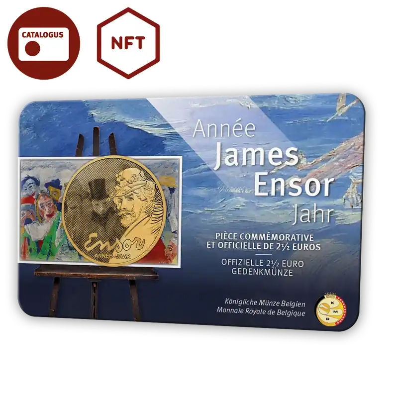 Als eerbetoon aan de 75 jaar geleden overleden James Ensor (1860 – 1949) is 2024 uitgeroepen tot het James Ensor Jaar! Ter viering van de Belgische grootmeester, avant-gardekunstenaar, colorist, realist, symbolist, een 'artist's artist', vernieuwer, inspirator, onderzoeker van het licht; een modern kunstenaar met internationale reputatie, is er in december 2023 in zijn geboortestad Oostende een heus festival van start gegaan. Diverse exposities in onder andere Mu.ZEE en activiteiten in het teken van Ensor, zijn creaties en inspiratie, geeft Oostende het stokje door aan Brussel. In Brussel is ook genoeg te beleven op het gebied van tentoonstellingen in het KBR en Bozar. Of doe mee aan de Nationale Expo en maak uw eigen Ensor-geïnspireerd werk. In het najaar is Antwerpen aan de beurt. Met exposities bij het KMSKA met de grootste Ensor collectie ter wereld, maar ook nog vier andere Antwerpse musea en een varia aan activiteiten. Als veelzijdig en eigenzinnig kunstenaar heeft James Ensor een heel breed oeuvre. Van tekeningen en etsen, stillevens of landschappen, naar levensgrote werken met maskerades, geraamtes en karikaturen. En alles wat daar tussenin zit. Inspirator voor velen kunstenaars na hem. Een bijzonder kunstenaar verdient een bijzonder extra!Het James Ensor Jaar was voor de Koninklijke Munt van België aanleiding om een 2½ euromunt uit te geven met twee van zijn bekendste werken erop. De 2½ euro wordt geslagen in BU-kwaliteit en verschijnt in een coincard met twee taalversies. Ter ere van deze bijzondere gelegenheid is nu als primeur bij een Belgische munt een gratis NFT* aan de coincard toegevoegd! Kijk snel welk werk van Ensor bij u tot leven komt en geniet van zowel de munt als het exclusieve digitale extraatje!De voorzijde van de munt toont in de achtergrond de twee centrale figuren uit het indrukwekkende ‘de Intrige’. Daaroverheen links in reliëf het fameuze ‘Zelfportret met Bloemenhoed’ onderin het signatuur van Ensor en de referentie naar het James Ensor Jaar. Het extraatje, de NFT*, is bij deze munt toegevoegd aan de coincard. Bekijk het stappenplan in de speciale folder of online en claim uw NFT. Er zijn vijf verschillende NFT’s in evenzoveel gradaties van zeldzaamheid. De werken van Ensor komen met een ‘glitch’ of siddering tot leven!* NFT: staat voor Non-Fungible Token. Een NFT is een digitaal eigendomscertificaat, opgeslagen op een blockchain, wat verwijst naar een digitaal media-object. Aan 2 x 5.000 coincards 2 ½ euro James Ensor Jaar 2024 zijn QR codes toegevoegd waarmee een NFT kan worden geclaimd. Er zit zodoende een exclusief extraatje bij de munten! U ontvangt de coincard in een speciale folder met stap voor stap uitleg. Ook kunt u meer informatie en uitleg vinden op www.herdenkingsmunten.be/nft