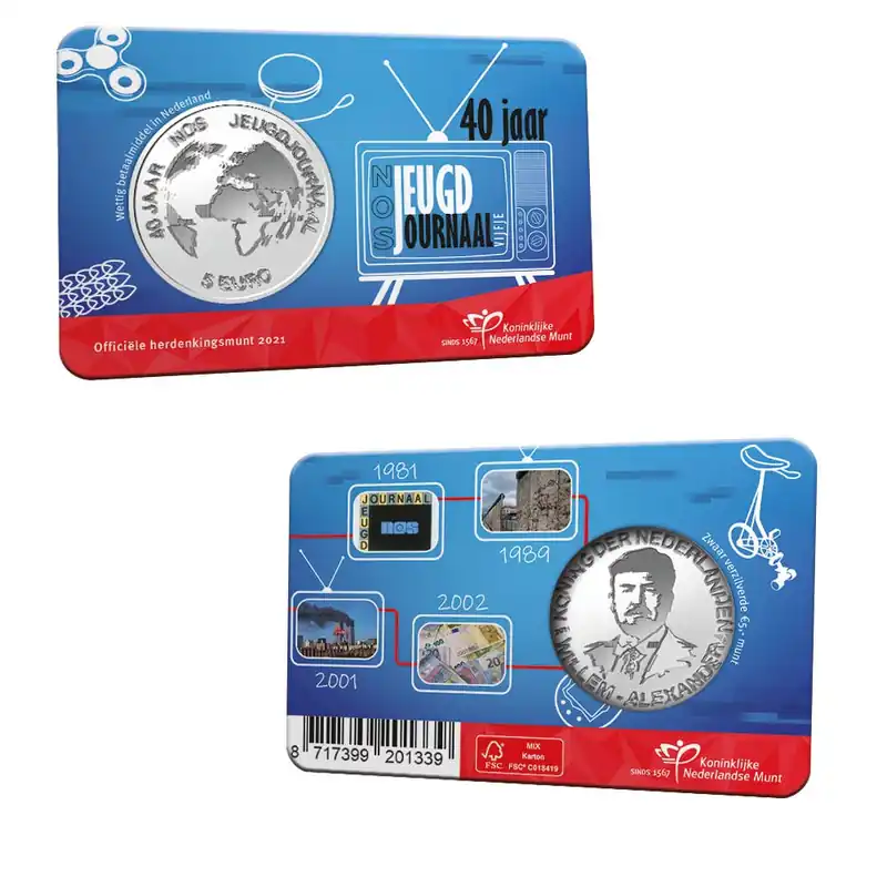 Het NOS Jeugdjournaal viert dit jaar zijn 40-jarig jubileum! Veel kinderen zijn opgegroeid met het populaire programma, dat hen op een toegankelijke wijze het nieuws brengt uit binnen- en buitenland. Ter ere van het jubileum slaat de Koninklijke Nederlandse Munt in opdracht van het ministerie van Financiën een herdenkingsmunt: het NOS Jeugdjournaal Vijfje.Het NOS JeugdjournaalHet nieuwsprogramma voor kinderen was voor het eerst te zien op 5 januari 1981. Het werd alleen op doordeweekse dagen uitgezonden en duurde zeven minuten. In schoolvakanties was er geen NOS Jeugdjournaal. Inmiddels is het programma 365 dagen per jaar op televisie en is de zendtijd uitgebreid naar twintig minuten.Het is een van de langstlopende nieuwsprogramma’s voor kinderen ter wereld, net als het Britse programma Newsround op de BBC. Newsround had in de eerste jaren een positieve insteek waarbij vooral vrolijk nieuws werd gebracht. Het NOS Jeugdjournaal wilde juist taboes en zware onderwerpen niet schuwen, maar op een heldere en kindvriendelijke manier aankaarten. Voor het programma begon, was uit onderzoek gebleken dat kinderen behoefte hadden aan een serieus nieuwsprogramma. De doelgroep wordt dan ook actief bij het nieuws betrokken. Dagelijks kunnen kijkers op de site hun mening kwijt en reageren op een stelling. Tijdens het Jeugdjournaal verkiezingsdebat mogen schoolkinderen lijsttrekkers interviewen. Dit is uniek in de wereld. Het programma won door de jaren heen diverse prijzen, zoals de Gouden Stuiver (de belangrijkste prijs voor kinderprogramma's in Nederland) en een NPO Zapp Award.Inspiratie van de ontwerperHet NOS Jeugdjournaal Vijfje is ontworpen door kunstenaar Gabriel Lester. Lester werd bij het ontwerpen geïnspireerd door de verstoringen en oneffenheden die soms optreden in een televisiebeeld: glitches. Op de voorzijde staat Koning Willem-Alexander. Het portret is afgebeeld in twee tonen, waardoor het lijkt alsof er haperingen in zitten. Dit geeft het een elektrisch karakter. Op de keerzijde is een wereldbol te zien, het symbool van het dagelijkse wereldnieuws. Deze is op eenzelfde manier bewerkt, waardoor de munt als geheel doet denken aan een televisiescherm.