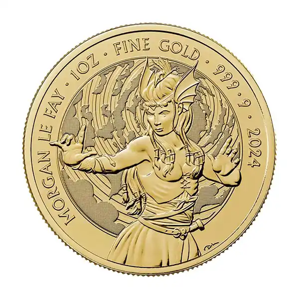 In de zesde en laatste release van de Myths and Legends serie van de Royal Mint staat Morgan Le Fay centraal. In de Arthuriaanse overlevering komt Morgan Le Fay voor als een veelzijdig personage, vaak afgebeeld als de halfzus van koning Arthur en een formidabele tovenares. Haar reputatie wordt bepaald door haar mystieke vermogens, zowel heilzaam als kwaadaardig. Ze speelde verschillende rollen in verschillende verhalen, soms als antagonist en soms als genezer of beschermer. Elke één ounce gouden munt is geslagen in .9999 puur goud en is afgewerkt volgens de edelmetaalstandaard van The Royal Mint, en is ook verkrijgbaar als een één ounce zilveren editie.