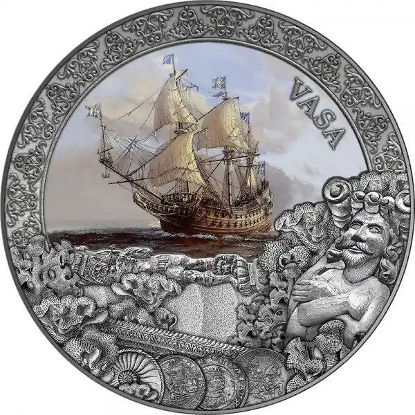 Deze bijzondere zilveren munt is de derde munt uit de serie “Grand Shipwrecks in a History” en is gewijd aan de grote scheepswrakken in de geschiedenis en hun schatten. Deze derde uitgave is gewijd aan de Vasa. De munt is uitgebracht in een gelimiteerde oplage van 500 stuks wereldwijd en wordt geleverd in een luxe geschenkdoos.
