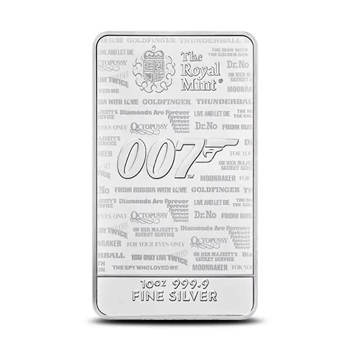 In 2020 voegt zich een Brits icoon toe aan het edelmetaalassortiment van The Royal Mint. Een van de meest iconische speelfilmpersonages van de afgelopen 60 jaar is het personage James Bond van de Britse geheime dienst. James Bond heeft sinds dit jaar ook eigen baren van 10 troy ounce, 1 troy ounce en 1 troy ounce goud. Deze stijlvolle zilveren baar is nu verkrijgbaar en uitgebracht in een gelimiteerde oplage van 6.000 stuks wereldwijd.