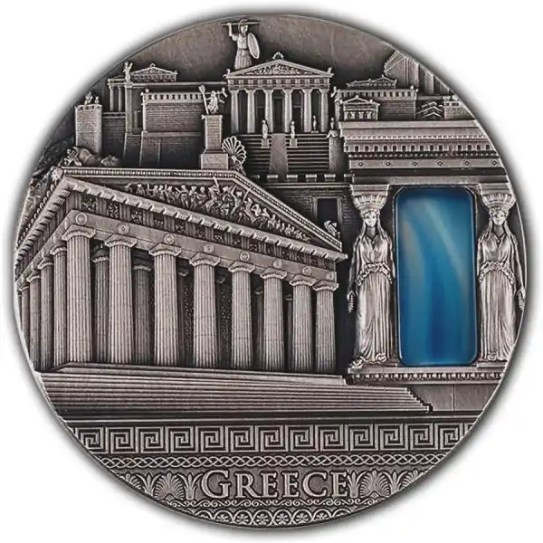 Deze zilveren munt is de vierde release afkomstig uit de Imperial Art Series. Op de voorkant van deze prachtige zilveren munt zien we de bijna 2500 jaar oude Griekse Parthenon-tempel. De voorzijde toont een binnenaanzicht van de tempel. Het bevat een afbeelding van Socrates en een profiel van Hare Majesteit Koningin Elizabeth II. De voorzijde heeft ook een blauw met agaat gevuld venster links van Socrates. De munt is geslagen in 999 puur zilver. Het heeft een gelimiteerde oplage van slechts 500 stuks en wordt geleverd in een luxe doos.