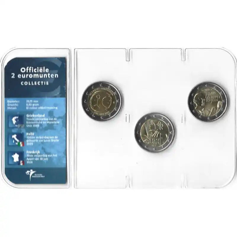 Officiële 2 Euromunten collectie KNM UNC Griekenland 2009 – Italië 2009 – Frankrijk 2010