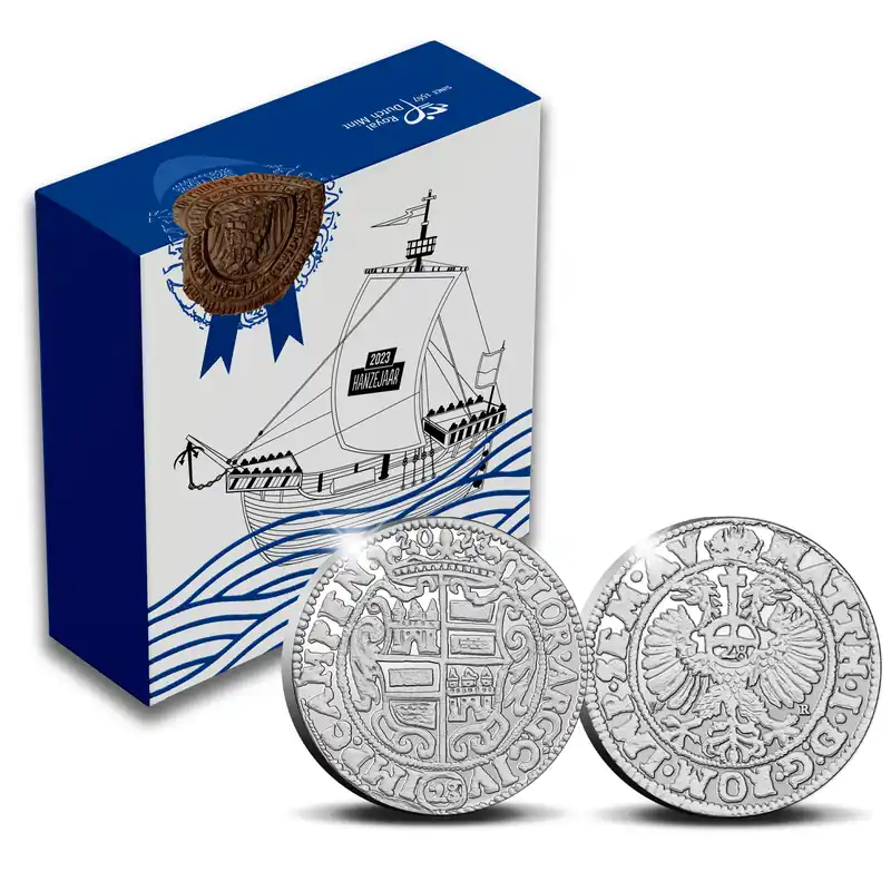 Met trots lanceert de Koninklijke Nederlandse Munt een officiële herslag van de zilveren Florijn van Kampen uit 1618, ter ere van 800 jaar Hanzesteden. De munt heeft een nominale waarde van 28 Stuivers, wordt ook gekend onder de naam Adelaarsdaalder en heeft als zilveren Florijn langs vele Hanzesteden gereisd. Deze variant werd geslagen in Kampen, een belangrijke spil in het Hanzenetwerk. De zilveren Florijn van Kampen wordt herslagen in zilver en goud, in zowel 1 als 2 ounce.Ontwerp Zilveren Florijn van KampenVanwege de gunstige ligging was Kampen al veel langer een handelsstad dan dat het een Hanzestad was, in 1441 werd het officieel lid van de Hanze. Om goed te kunnen handelen met de af en aan varende koggeschepen, waren grote zilveren munten zoals de Florijn intrek. De eerste emissie van deze zilveren Florijn vond plaats van 1616 tot 1686.De van origine zilveren munt toont op de voorzijde het gekroonde stadswapen van Kampen. Het omschrift: ‘FLOR.ARG.CIV.IMP. CAMPEN’, wat ‘zilveren Florijn van het Burgerrijk Kampen’ betekent. Op de keerzijde staat een tweekoppige adelaar en het omschrift: ‘MATTH.I.D. ROM.IMP.SEM.AVGV’, wat ‘Uit naam van Matthias I als heilige Roomse keizer’ betekent. Bij de herslag wordt het jaartal 2023 op de munt geplaatst. De Florijn van Kampen in Zilver Proof wordt geleverd in een luxe verpakking inclusief een genummerd Certificaat van Echtheid. De verpakking toont een koggeschip in vaart met het officiële Hanzejaar 2023 logo in het zeil. Links het zegel van waarmee de burgers van Kampen tolvrijheid verkregen.