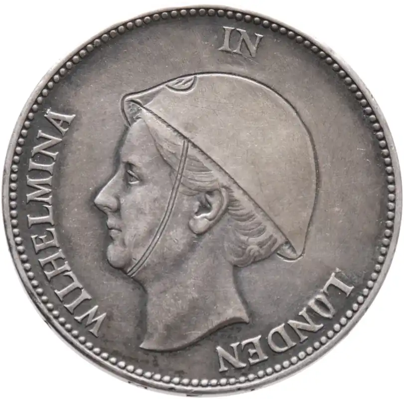 Achtergrond bij de graveringAls protest tegen de Duitse bezetter en doordat steeds meer mensen thuis zaten, ontstond de zogenaamde huisvlijt. Allerlei zelfgemaakte voorwerpen die het land en het verzet vereerden werden thuis gemaakt. Zo werden ook Nederlandse munten bewerkt om de afkeer tegen de Duitsers te tonen.Normaal gesproken staat de volgende tekst op de voorzijde van de gulden:WILHELMINA KONINGIN DER NEDERLANDENDoor een aantal letters weg te halen en de letter ‘A’ van Nederlanden te vervangen door de ‘O’ ontstaat het volgende:WILHELMINA IN LONDENDe tekst verwijst logischerwijs naar Wilhelmina’s verblijf in Londen en de helm naar het symbool van strijd en haar openlijke verzet op de radio tegen de Duitsers.