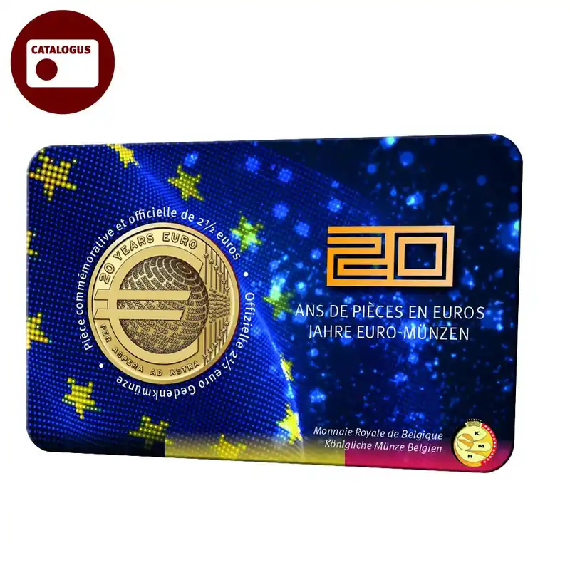Sinds 2002 is de euro de munteenheid van 19 EU-landen met meer dan 340 miljoen inwoners en de op één na belangrijkste valuta ter wereld. Euromunten en eurobiljetten vormen een tastbare, dagelijkse herinnering aan de vrijheid, het betaalcomfort en de vele mogelijkheden die de Europese Unie ons te bieden heeft.Zo maakt de euro het ons makkelijk om met vertrouwen te sparen en te beleggen, om prijzen te vergelijken en zaken te doen alsook om makkelijker te werken, te studeren of zelfs met pensioen te gaan in het buitenland. Na 20 jaar zijn we nagenoeg vergeten dat we ooit in Belgische frank betaalden en dat we voor onze vakantie telkens naar de bank moesten hollen om een voorraad lires, peseta's of drachmes in te slaan.Een klinkende munt van 2½ euroals kers op de verjaardagstaartOp de beeldzijde prijkt het euroteken, op een globe achtige achtergrond van binaire getallen, eromheen quotes en 20 YEARS EURO. De getallenreeks: 11100010 10000010 10101100 staat voor het ‘€’. Het citaat onderaan “PER ASPERA AD ASTRA” is van ere-gouverneur Jan Smets, destijds de eurocommissaris, verantwoordelijk voor de invoering van de euro in België. “Via moeilijkheden naar de sterren”, is nog altijd actueel en treffend voor de invoering en het gebruik van de op één na grootste munteenheid ter wereld. Rechts in het ontwerp zijn sterren en strepen weergegeven, geïnspireerd op de waarde zijde van euro circulatie munten. In het pad van de sterren zijn de alledaagse voordelen van het gebruik van de euromunt benoemd: work, study, retire, travel, shopping, business (werk, studie, pensioen, reizen, winkelen, handel). Links onder de sterren staat de letter P, initiaal van graveur/modelleur Pannos Goutzemisis.Op de muntzijde staan de gebruikelijke grafische elementen zoals de waarde, het jaartal en de Europese landkaart afgebeeld. Een euro-geïnspireerde coincard-verpakking zorgt voor de finishing touch.