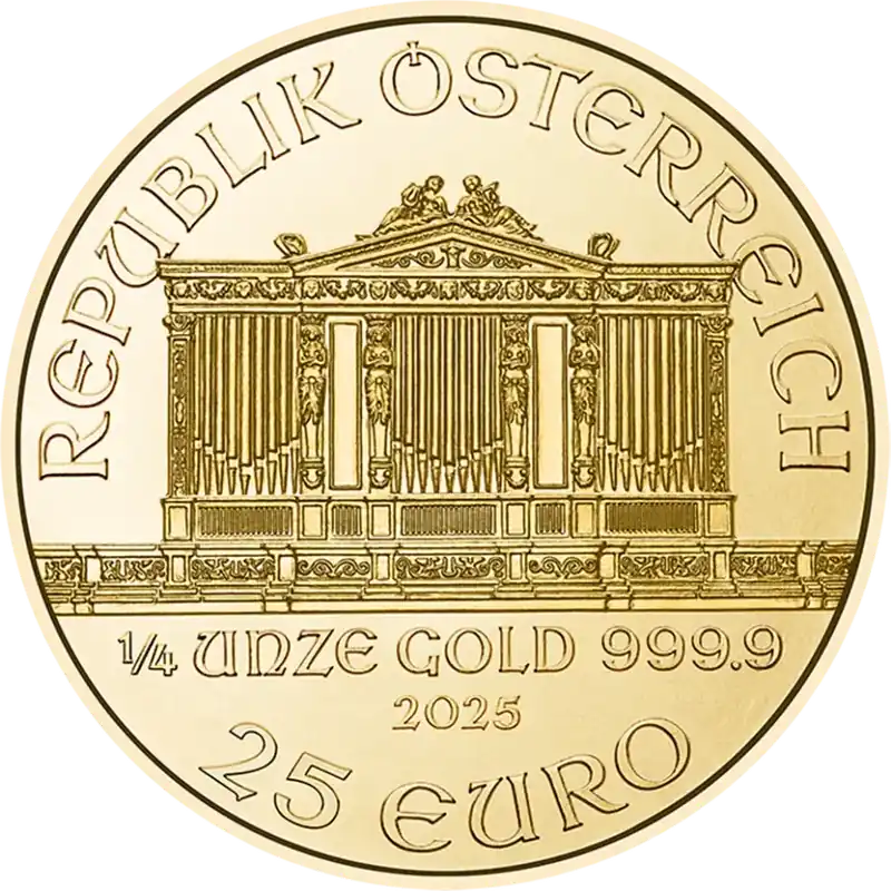 De Philharmoniker 1/4 troy ounce gouden munt 2026 is een goede optie voor beginnende beleggers én is een geweldig cadeau voor iemand speciaal. De Philharmonic is de meest succesvolle munt geproduceerd door de Oostenrijkse Munthuis Münze Österreich. Gewaardeerd om zijn schoonheid en zuiverheid is de 2023 editie nu te bestellen. De munt wordt geslagen in .9999 puur goud (24 karaats).