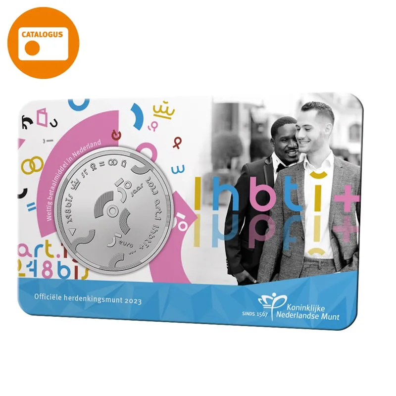 In 1964 gebeurt er iets op de Nederlandse televisie wat nog nooit eerder is voorgekomen: voorzitter van het COC en homoseksueel Benno Premsela komt openlijk in beeld. Het is voor deze tijd ondenkbaar, want tot dit moment kwamen lesbische, homoseksuele en biseksuele mensen alleen in beeld met een balkje voor de ogen of vanaf de rug gefilmd. De gedurfde stap van Premsela is een van de voorbeelden van een roep die steeds luider wordt. Een roep vanuit de organisatie COC Nederland om meer emancipatie en sociale acceptatie van LHBTI+ personen.Iets minder dan 10 jaar later, op 19 september 1973, krijgt COC de lang bevochten koninklijke goedkeuring. De Koninklijke Nederlandse Munt slaat, in opdracht van het ministerie van Financiën, een officiële herdenkingsmunt ter ere van 50 jaar erkenning COC.50 jaar erkenning COCCOC (Cultuur- en Ontspannings Centrum) Nederland wordt opgericht als de Shakespeare Club op 7 december 1946, door de lezerskring van tijdschrift Levensrecht. Hiermee is het COC de oudste, nog bestaande LHBTI+ beweging ter wereld. De organisatie, vanaf 1949 onder de huidige naam COC, zet zich in voor belangenbehartiging, gelijke rechten en sociale acceptatie van lesbische, homoseksuele, bi+, transgender en intersekse personen (LHBTI+). Hoewel het COC al meerdere keren de aanvraag voor het ontvangen van rechtspersoonlijkheid indient, wordt deze tot twee keer toe afgewezen vanwege weerstand uit Den Haag. Een derde poging heeft wel succes: op 19 september 1973 ontvangt COC de erkenning, vaak aangeduid als ‘koninklijke goedkeuring’ van de Nederlandse overheid. Deze erkenning betekent veel: het staat voor het streven naar gelijke behandeling door de overheid.Mijlpalen en uitdagingenWaar in de jaren 50 en 60 een groot taboe heerst op homoseksualiteit, is de komst van de munt anno 2023 juist het tegenovergestelde van een taboe. Het laat de stappen zien die de organisatie heeft gezet. De verbindende, voortrekkende en vertegenwoordigende rol die het COC heeft, is verantwoordelijk voor tal van mooie initiatieven zoals Paarse Vrijdag voor acceptatie op school, een wettelijk discriminatieverbod en verankering van LHBTI+ rechten in de Grondwet. Ook internationaal is COC actief. Zo krijgen LHBTI+ organisaties in meer dan 35 landen de steun die ze nodig hebben. 50 jaar na de eigen erkenning is COC dan ook in staat om organisaties in andere landen hierbij te helpen.Er is echter nog een lange weg te gaan. Nederland staat op de 14e plek van landen waar alles goed is geregeld voor LHBTI+ personen. Er is nog altijd fysiek en verbaal geweld en vanuit de maatschappij klinkt nog veel weerstand en onbegrip. Het COC blijft zich onvermoeibaar inzetten voor een diverse en inclusieve samenleving.Ontwerp De 50 jaar erkenning COC herdenkingsmunt in UNC en BU kwaliteit is ontworpen door Coen van Ham. De ontwerper staat met de munt stil bij de ontwikkeling die het COC heeft meegemaakt sinds de erkenning in 1973. De munt is ontworpen als dwarrelende confetti: de verschillende soorten confetti staan voor de mijlpalen die het COC heeft bereikt.De voorzijde toont het portret van Koning Willem-Alexander, opgebouwd uit dwarrelende confetti. Rondom het portret staat ‘Willem-Alexander Koning der Nederlanden’ geschreven, in een speciaal ontworpen lettertype. Op de keerzijde van de munt staat in het midden het logo van COC. Rondom staan diverse symbolen afgebeeld. Deze staan voor de mijlpalen die het COC heeft bereikt, waaronder de openstelling van het burgerlijk huwelijk voor paren van hetzelfde geslacht in 2001 (de twee ringen) en de verplichting van LHBTI+ voorlichting op scholen in 2012 (het boekje).