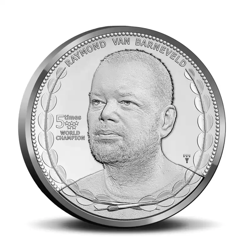 Raymond van Barneveld neemt dit jaar afscheid van de professionele dartsport. Op 8 februari 2020 viert hij zijn officiële afscheid in AFAS Live. Om het afscheid en de roemrijke carrière van Raymond van Barneveld te vieren, geeft de Koninklijke Nederlandse Munt nu een speciale penning uit!Onze dartlegende “Barney” behoort al ruim 2 decennia tot de beste darters ter wereld. Van Barneveld werd bekend toen hij als postbode in 1998 de eerste Nederlandse wereldkampioen darts werd door de finale te winnen van Richie Burnett. Dit was nog maar het begin van het succes van Van Barneveld. Hij mag zichzelf inmiddels vijfvoudig wereldkampioen noemen: vier keer bij de British Darts Organisation (BDO) en één keer bij de Professional Darts Corporation (PDC). Daarnaast werd Van Barneveld in 1999 door Prinses Beatrix geridderd in de Orde van Oranje-Nassau.Wist u dat… Raymond van Barneveld zelf ook fervent muntliefhebber is?Het ontwerpOp de voorzijde van de penning wordt het 3D portret van Raymond van Barneveld getoond. Het portret wordt omlijst door de flights van dartpijlen die tezamen een symbolische bladerkroon vormen; daaromheen wordt een sierlijke parelrand weergeven. Daarnaast is de tekst “5-times World Champion” weergeven met de 5 bijbehorende sterren. Tot slot vindt u het munthuis- en muntmeesterteken op de voorzijde.Op de keerzijde van de penning staat, uiteraard, een dartbord centraal.De Raymond van Barneveld Penning is verpakt in een stoere blisterverpakking met daarop de bekende Barney Army dartpijl flight. Centraal in deze flight is de voorzijde van de penning met het portret van Raymond van Barneveld. De achterzijde van de verpakking toont het silhouette van de winnaar Raymond van Barneveld in zijn triomfantelijke pose. De keerzijde van de penning is in de blisterverpakking ook zichtbaar.