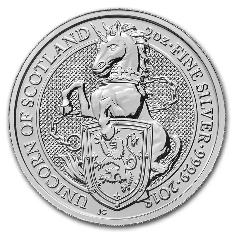 De eerste nieuwe zilveren 2 troy ounce Queens Beatst munt van 2018: The Unicorn. De munt heeft een puurheid van 99,99% en bevat 62,2 gram puur zilver. De Queens Beast serie bestaat uit een 10-delige uitgave van de Britse Royal Mint.