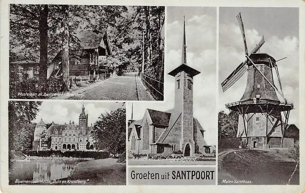 J.P. Exel, Haarlem. Gelopen ansichtkaart met half verwijderde postzegel en stempel 1938. Knikje oberhoekje rechts.