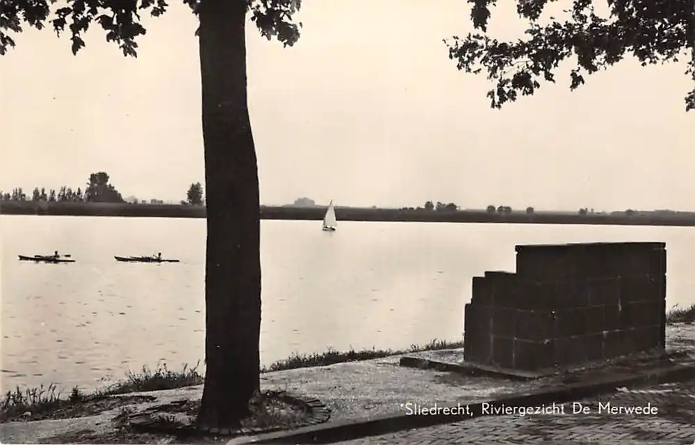 Uitg. Boekhandel A. v. Wijngaarden, Sliedrecht. Gelopen ansichtkaart met postzegel en verwijderde postzegel en stempel 1957. Knikje bovenrandje.