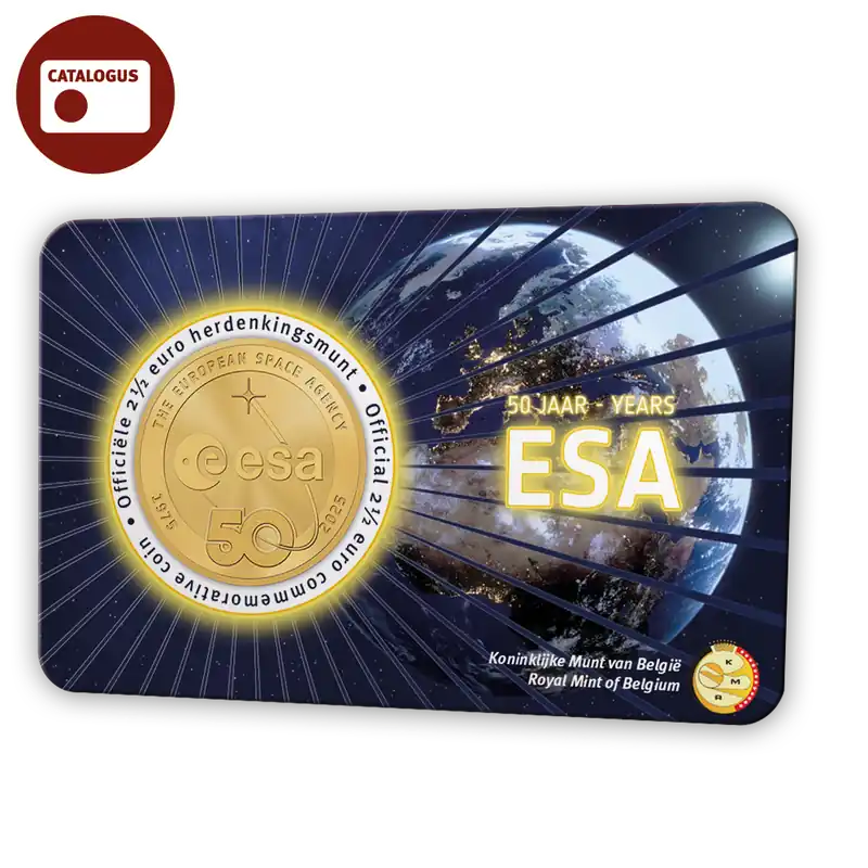 De ruimte heeft altijd tot onze verbeelding gesproken – en in 2025 is er een stellaire reden om dit te vieren: het Europees Ruimteagentschap wordt 50! Om deze kosmische mijlpaal te vieren, geeft de Koninklijke Munt van België een speciale munt van 2,50 euro uit ter ere van vijf decennia Europese prestaties in de ruimte. Over de European Space AgencyDe European Space Agency (ESA) is Europa’s toegangspoort tot de ruimte.ESA is een intergouvernementele organisatie, opgericht in 1975, met de missie om de ontwikkeling van Europa’s ruimtevaartcapaciteit vorm te geven en ervoor te zorgen dat investeringen in de ruimte ten goede komen aan de burgers van Europa en de wereld.ESA heeft 23 lidstaten: België, Denemarken, Duitsland, Estland, Finland, Frankrijk, Griekenland, Hongarije, Ierland, Italië, Luxemburg, Nederland, Noorwegen, Oostenrijk, Polen, Portugal, Roemenië, Slovenië, Spanje, Tsjechië, het Verenigd Koninkrijk, Zweden en Zwitserland. Letland, Litouwen en Slowakije zijn geassocieerde leden.Het ESA heeft een formele samenwerking opgezet met vier andere lidstaten van de EU. Canada neemt deel aan sommige ESA-programma’s in het kader van een samenwerkingsovereenkomst.Door de financiële en intellectuele middelen van zijn leden te coördineren, kan ESA programma’s en activiteiten ondernemen die veel verder gaan dan het bereik van een enkel Europees land. Het werkt in het bijzonder samen met de EU aan de uitvoering van de programma’s Galileo en Copernicus en met Eumetsat voor de ontwikkeling van meteorologische missies.Een gouden jubileum verdient een goudkleurige munt!De 50ste verjaardag van de European Space Agency inspireerde de Koninklijke Munt van België om een munt van 2½ euro uit te geven. De munt is tot stand gekomen in samenwerking met ESA en is voorzien van het officiële jubileumlogo. De 2½ euromunt wordt geslagen in BU-kwaliteit en verschijnt in een coincard met twee taalversies.
