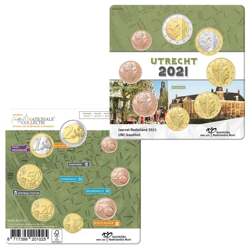 In 2021 is er vanuit De Nederlandsche Bank geen vraag naar nieuwe euromunten omdat er nog genoeg Nederlands muntgeld in omloop is. U zult dan ook geen Nederlandse euromunten met het jaartal 2021 tussen uw wisselgeld aantreffen. Met de Jaarsets van de Koninklijke Nederlandse Munt bent u wel verzekerd van alle acht Nederlandse euromunten van 2021. Een unieke kans! De Jaarset Nederland 2021 in UNC-kwaliteit is het vijfde en laatste deel van de succesvolle serie ‘Nederlandse Steden’ en draait om Domstad Utrecht. Maak uw serie compleet!Ontdek UtrechtMet meer dan 350.000 inwoners is het centraal gelegen Utrecht de vierde gemeente van Nederland. Het oude en gezellige centrum van de stad staat bekend om de karakteristieke werfkelders langs de vele grachten. Bijna overal in de binnenstad kunt u zich oriënteren op de monumentale, gotische Domtoren: hét icoon van Utrecht. De Domstad kent tal van bezienswaardigheden en activiteiten voor jong en oud. U kunt uw winkelhart ophalen in het vernieuwde Hoog Catharijne, een dansje wagen in TivoliVredenburg en de allerkleinsten kunnen hun ogen uitkijken in het nijntje museum. Bovendien is het Muntgebouw, dat tot maart 2020 als het onderkomen van de Koninklijke Nederlandse Munt fungeerde, in Utrecht te vinden.Uncirculated (UNC)Munten die voor de omloop zijn geslagen, maar niet in omloop worden gebracht, krijgen de kwaliteit uncirculated/ongecirculeerd (UNC). Tijdens de productie worden de munten in een metalen vergaarbak opgevangen. In 2021 gaat er geen enkele Nederlandse euromunt in circulatie, u zult deze dus niet tussen uw wisselgeld vinden! De Jaarset Nederland in UNC-kwaliteit bevat alle acht Nederlandse euromunten van 2021.Wilt u ieder jaar verzekerd zijn van de Jaarset Nederland UNC-kwaliteit? Sluit dan een abonnement af!