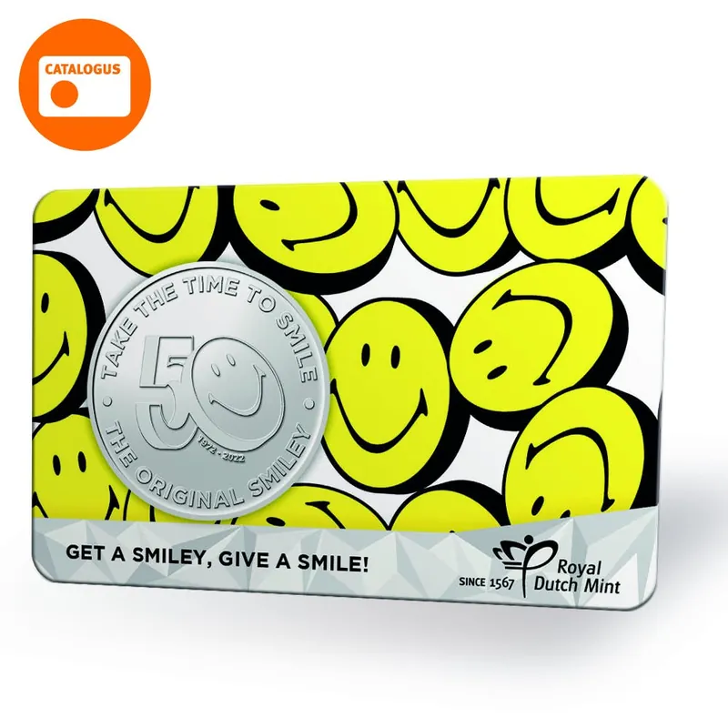 The Smiley Company, bedenkers van de originele ‘smiley’, bestaat 50 jaar! Om dit te vieren, geeft de Koninklijke Nederlandse Munt in samenwerking met de Smiley Movement en de Voedselbank Amsterdam een speciale penning in coincard uit. De gehele opbrengst van de Voedselbank Amsterdam-coincards gaat naar de Voedselbank Amsterdam, zodat zij met Kerstvoedselpakketten kunnen uitdelen. Get a smiley, give a smile!De Voedselbank AmsterdamIn Nederland leven meer dan een miljoen mensen onder de armoedegrens. Zij hebben vaak niet genoeg geld om elke dag eten op tafel te zetten. De Voedselbank Amsterdam voorziet daarom wekelijks ongeveer 1900 gezinnen van voedselpakketten. Elke verkochte penning staat gelijk aaneen voedselpakket: 100% van de opbrengst gaat dus naar de Voedselbank Amsterdam. Hiervan kunnen de ontvangers niet alleen een lekkere maaltijd klaarmaken tijdens Kerst, maar ook in de dagen daaromheen!Zo kunnen degenen die het niet zo breed hebben, toch genieten van de feestdagen.Smiley MovementOntstaan in 1972 om feel-good nieuws te verspreiden, is de Smiley uitgegroeid tot een van de belangrijkste iconen in graphic design. Hun creatieve boodschap draagt positiviteit uit en brengt mensen samen. Bovendien zetten ze sociale en emotionele lessen op de agenda. Smiley’s simpele boodschap ‘Take the Time to Smile’ uit 1972 is vijftig jaar later nog steeds relevant.In 2017 zag filantropist en sociaal entrepreneur Nicolas Loufrani (Smiley’s CEO) een gat in de markt tussen mensen die graag iets willen teruggeven aan de maatschappij en de miljoenen goede doelen die steun kunnen gebruiken. Dus richtte hij Smiley Movement op. Smiley Movement is een nonprofitbedrijf gesponsord door de originele SmileyⓇ brand. Ze hebben als visie om positieve maatschappelijke verandering teweeg te brengen. Dit doen zedoor een vrolijkere, gelijkwaardigere en duurzamere wereld te creëren, waar iedereen hand in hand samenwerkt om dringende maatschappelijke en milieugerelateerde problemen op te lossen.Het ontwerpOp de voorzijde van de penning ziet u het 50-jarige jubileumlogo van The Smiley Company met daaromheen hun slogan: Take The Time To Smile! Op de keerzijde staat een handje die het logo van de Voedselbank Amsterdam vasthoudt. Het handje reikt naar een ander handje met op de achtergrond smileys. Dit staat symbool voor het voedselpakket dat gedoneerd wordt en de ontvanger een lach bezorgt. De penning is verpakt in een coincard met de originele SmileyⓇ erop. Koop de penning nu en get a smiley, give a smile!