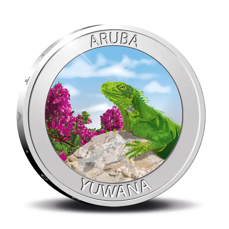 Op de Arubaanse herdenkingsmunt van het jaar 2021 ziet u de groene leguaan, ofwel ‘Yuwana’ in het Papiamento. Naast de opvallende kleur van de Yuwana kunt u het dier herkennen aan de halskwab, de schub op de wang en de kam die van de kop tot aan de staart loopt. Yuwana’s zijn geboren klimmers, maar ook zwemmen en duiken kunnen ze als de beste! Hun voeding bestaat vooral uit bladeren en vruchten. Hierbij weten ze de bladeren uit te zoeken die de meeste voedingsstoffen bevatten. De grootste bedreiging voor de Yuwana is de mens: hun vlees is een geliefde delicatesse in de soep en ook hun eieren worden gegeten. Hierdoor heeft de Yuwana de status van een bedreigde diersoort gekregen. In Aruba is het bij wet verboden om op de Yuwana te jagen. Het bijzondere Arubaanse dier is nu vereeuwigd op een gekleurde herdenkingsmunt. Voeg deze zeer bijzondere munt nu toe aan uw verzameling!
