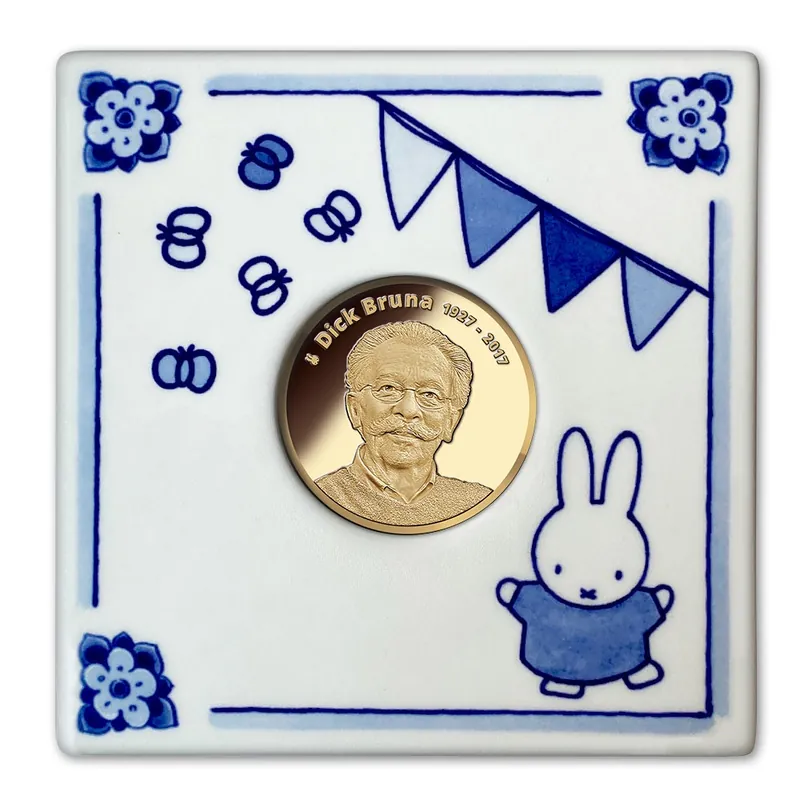 Nijntje is 65 jaar en dat vieren we! Tijdens een vakantie in Egmond aan Zee diende een wit konijn in de tuin van het vakantiehuisje van Dick Bruna en zijn familie als inspiratie voor nijntje. In samenwerking met Royal Delft geeft de Koninklijke Nederlandse Munt extra aandacht aan dit bijzondere jubileumjaar. De 1 ounce gouden uitgifte in handgeschilderde Delfts blauwe tegel brengt daarom een ode aan schrijver en tekenaar Dick Bruna. Een jubileumeditie die niet vergeten zal worden!Een ode aan Dick BrunaDick Bruna werd op 23 augustus 1927 geboren in Utrecht. Ruim zestig jaar lang maakte hij prentenboeken volgens een vast stramien: handzame, vierkante boekjes met rechts twaalf tekeningen en links een tekst van vier regels (op rijm). Zowel de warme kleuren als de speciale manier van tekenen (met rafelige lijnen) zijn typerend voor de stijl van Dick Bruna. Zijn prentenboeken zijn al decennialang geliefd bij jong en oud, in binnen- en buitenland! Op 16 februari 2017 overleed hij op 89-jarige leeftijd in zijn woonplaats Utrecht, waar ook het nijntje museum en een heus nijntje standbeeld te vinden zijn.OntwerpU treft de exclusieve gouden 65 jaar nijntje uitgifte in een aardewerk tegel van Royal Delft. De voorzijde van de uitgifte toont het karakteristieke portret van Dick Bruna met het opschrift ‘Dick Bruna 1927 – 2017’ en op de keerzijde vindt u het jubileumlogo van nijntje met de tekst ‘65 years of miffy’: haar internationale naam. U kunt de uitgifte uit het tegeltje halen zodat u zowel de voor- als keerzijde van dichtbij kunt bewonderen.De feestelijke illustraties op het tegeltje zijn handgeschilderd in de herkenbare Delfts blauwe kleuren van Royal Delft. Zelfs op de zijkanten van de tegel ziet u de herkenbare vlinders en bloemen van Dick Bruna. De klassieke tegel en de speelse versieringen in nijntje-stijl vormen een waardig eerbetoon aan Dick Bruna dat zeker niet mag ontbreken in de collectie van nijntje-verzamelaars!Let op: er worden slechts 10 stuks van deze internationaal geliefde jubileumuitgifte gemaakt, bestel daarom tijdig!Specificaties Royal Delft tegelAfmeting130 x 130 mmGewicht220 gMateriaalRoyal Delft aardewerkOplage10 stuksOntwerpHandgeschilderd en uniek genummerdIllustrations Dick Bruna © copyright Mercis bv, 1953-2020