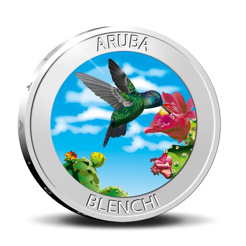 Op de Arubaanse herdenkingsmunt van het jaar 2020 prijkt een vrolijkgekleurde kolibrie. Deze kleine vogel staat ook wel bekend als ‘Blenchi’ het Papiamento. De kolibrie mag dan wel een vogel zijn, maar wordt door bezoekers van het eiland in eerste instantie vaak aangezien voor een hommel of ander insect. Door de snelle vleugelslag van zo’n 80 slagen per minuut maakt het vogeltje namelijk een zoemend geluid. Het kleine diertje is meestal te vinden in de buurt van bloemen. Met zijn spitse snavel slurpt de kolibrie namelijk nectar uit de bloemkelken: dit is zijn voornaamste voedselbron. Dankzij zijn snelle vleugelslag en kleine formaat (de kolibrie is de kleinste vogelsoort te wereld!) kan hij hiervoor de perfecte positie aannemen. Er bestaan meer dan 300 soorten kolibries in de wereld, op Aruba vindt men enkele hiervan. Voeg deze zeer bijzondere gekleurde herdenkingsmunt nu toe aan uw verzameling!Na de Prikichi (maïsparkiet), Soldachi (heremietkreeft) en de Turtuga (schildpad) is de Blenchi de hekkensluiter van deze Arubaanse herdenkingsmuntenserie.